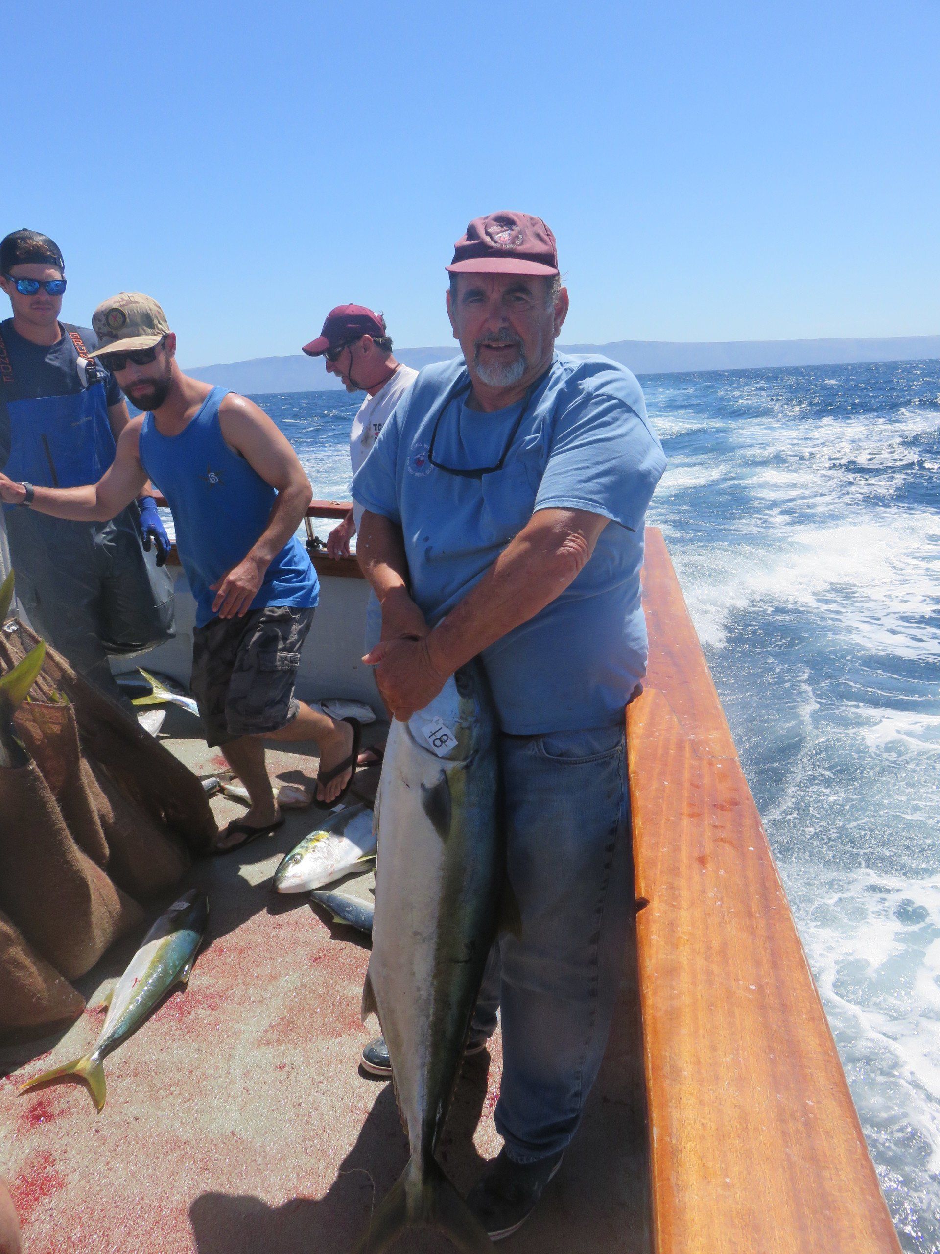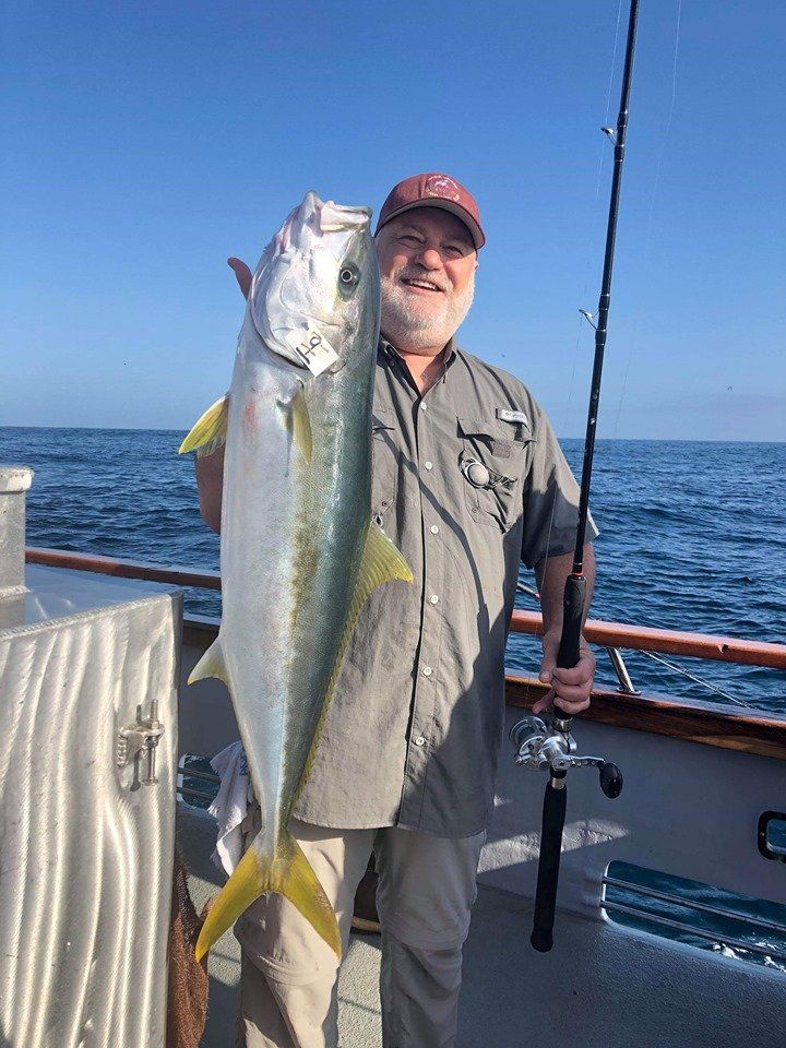 Trip #4: Boat: Thunderbird 2 day Departs: Thursday August 7th Fishing: August 8th, 9th Returns: August 9th pm Trip 4 started as usual with people arriving at Newport Landing at all hours of the day with anticipation of fishing. The preliminary reports from Gary Thompson were all too familiar to what we’ve seen this year. Bait was going to be an issue. And last but not least, was the fish seemed to pop up one day and then disappear the next. Nevertheless, everyone was ready to go. Friday morning saw us anchored at the usual cove off SCI. Weather was OK; fishable, but not a lot of fish. But the ones we caught were quality yellowtail and white sea bass. The sea lions provided ample entertainment …err I mean frustration. We hopped around to a few spots picking up the occasional calico but not much. Day 1 jackpot went to Alex Arthur (Justin Becker’s Guest) with the patch going to Nick Burson for some chunky YT’s Day 2 started much as it did Day 1 but the weather was worse than Day 1. We looked here and there with only 3 yellowtail to show for our efforts. Eventually, the Thunderbird turned towards offshore waters to try our luck at some bluefin. Unfortunately, the fish didn’t get the memo and we saw neither sign or had any bites. Mr, “Hey that’s my fish” Tom Hill was the lucky jackpot and patch winner for Day 2 with a 15# YT. So, there you have it, not a, “Hey you missed a great trip” kind ‘a trip but per usual, the members of our club all seemed to enjoy doing what we do. It’s not always about the fish; it’s about the people and the experience. LOL! Who am I kidding…we all want more fish. Until next time, step to the right/left and take up your slack.