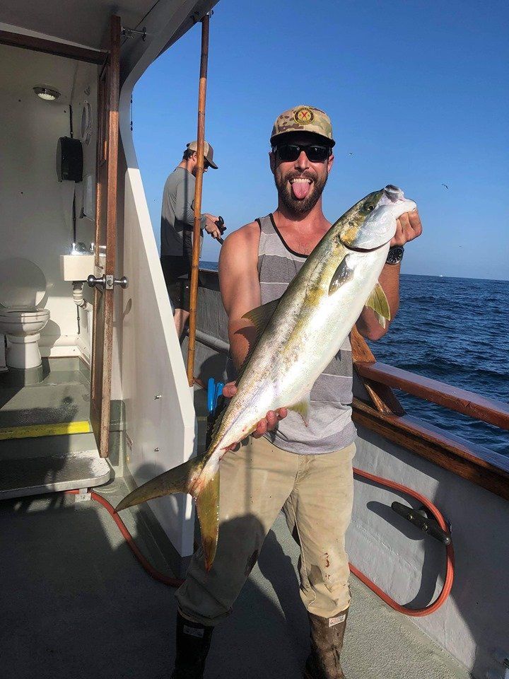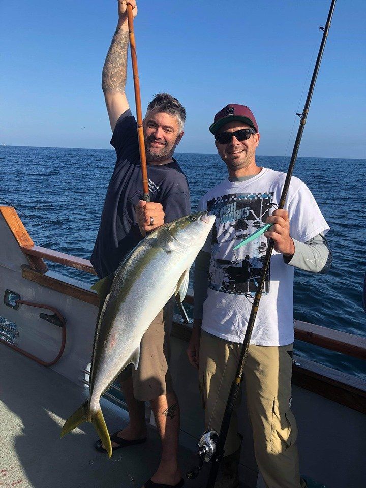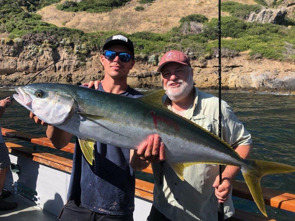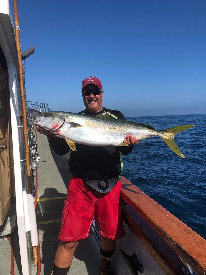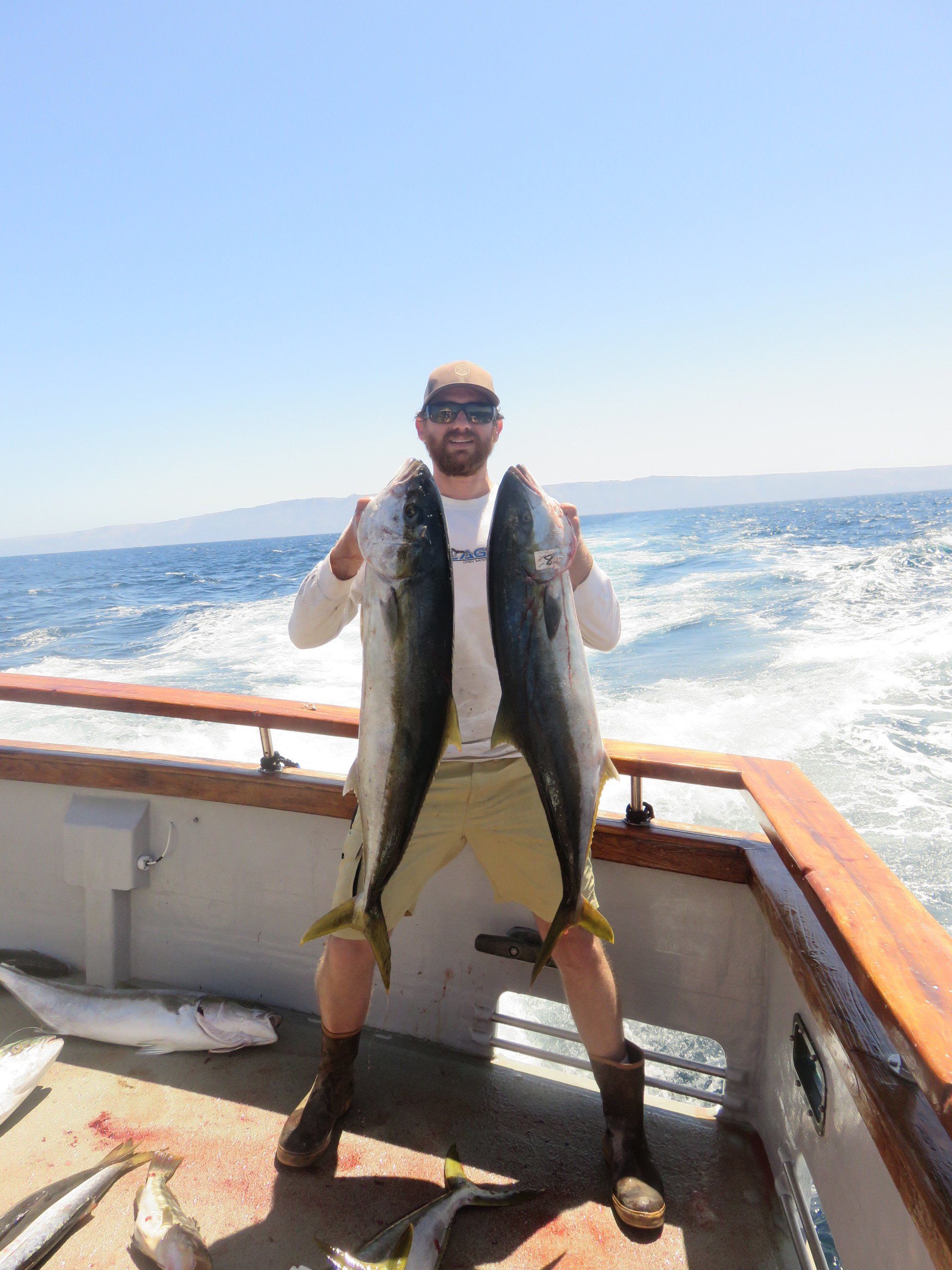 Getting the anchor down we got to work quickly and the yellows started to bite. Flylined sardines and surface iron were working well, and one after another we were all getting bit (well, most of us). By 9:30 am we had put about 30 yellowtail on the deck. The prior day had resulted in 1 YT caught, so we were all beyond excited for how this morning was playing out. The size of fish was good, ranging from the small size of 15 lbs to over 40 lbs! That’s right, another YT caught over 40 lbs this season. Ryan was the skillful angler catching this one, with it hitting 40.55 lbs on the spring scale. It taped out at 35.94 using the formula, resulting in a new leader in the season long Largest Yellowtail category. In addition to that one, there were at least three others caught that were over 30 lbs on the spring scale. These belonged to Mario Sr (33.5), Bill Parks (31.9) and Tony Beall (30.6). Congrats guys on the great catches!