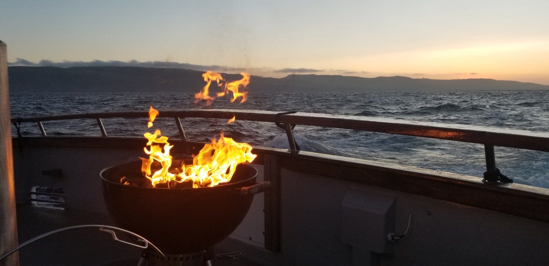 Around 3 pm Jeff determined we would be making the move to San Clemente Island. With a 3 hour run ahead of us, many members took this time for a well deserved nap. Upon waking up around 6 pm, Hayden’s drinking light was in full swing. Beers, bourbons and wines were flowing. Goofy lit up the weber with an entire bag of charcoal, and it proceeded to burn hotter than hell. Testing the temp by placing the lid on the grill, it quickly hit 550 and we determined it would probably max out the temp gauge. The steaks would cook quickly tonight! Dinner consisted of steaks, baked potato and salad. The steak was great, as was the potato. The galley was hot, but not unbearable. After dinner it was back to more beer/wine, while the crew caught some flying fish that were around the boat. These will be used laster on in the season for tuna. Oh yeah, Goody gave Ryan a new nickname this night after hitting the bottle hard. You can ask him about in on the next trip.