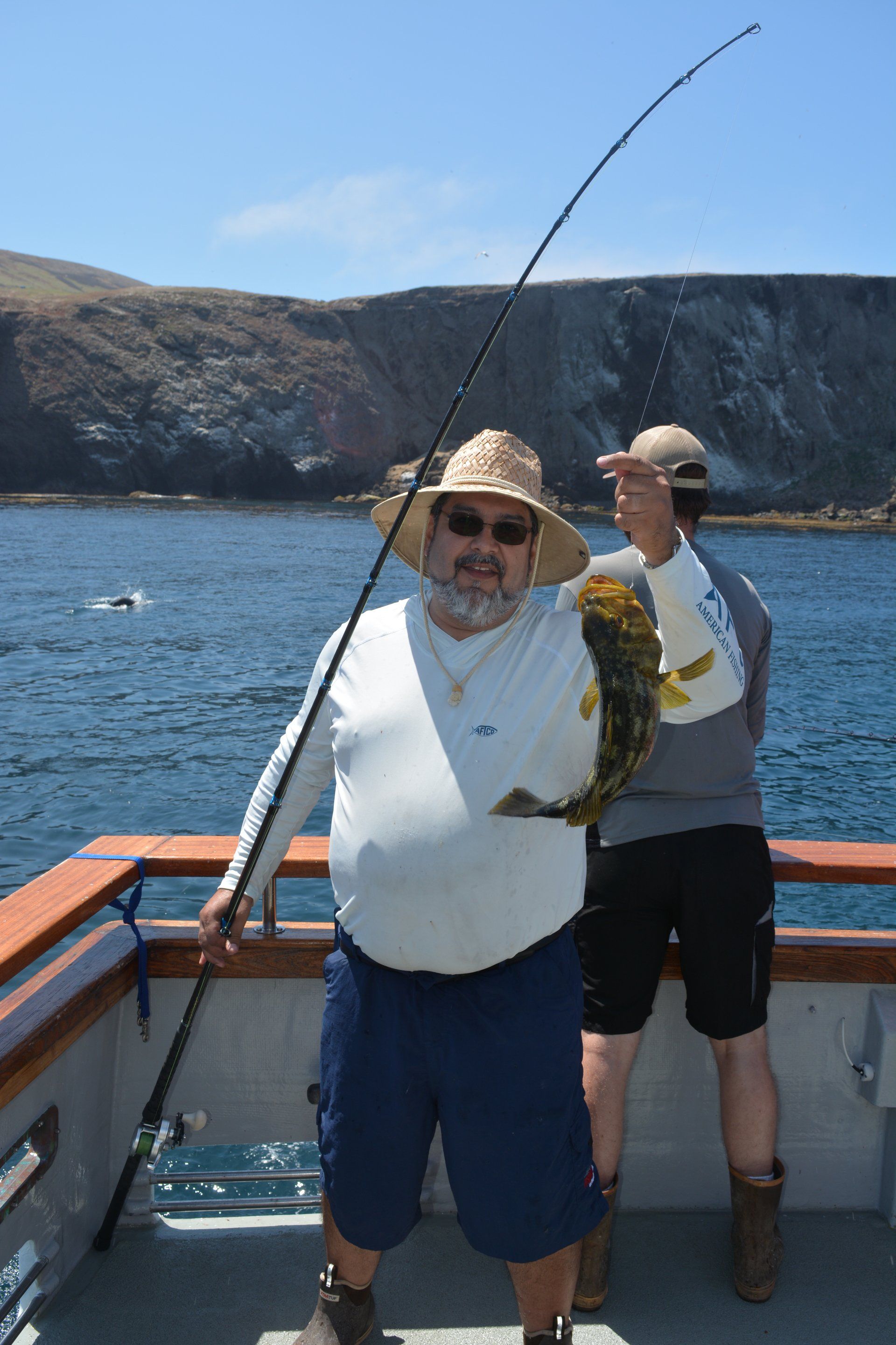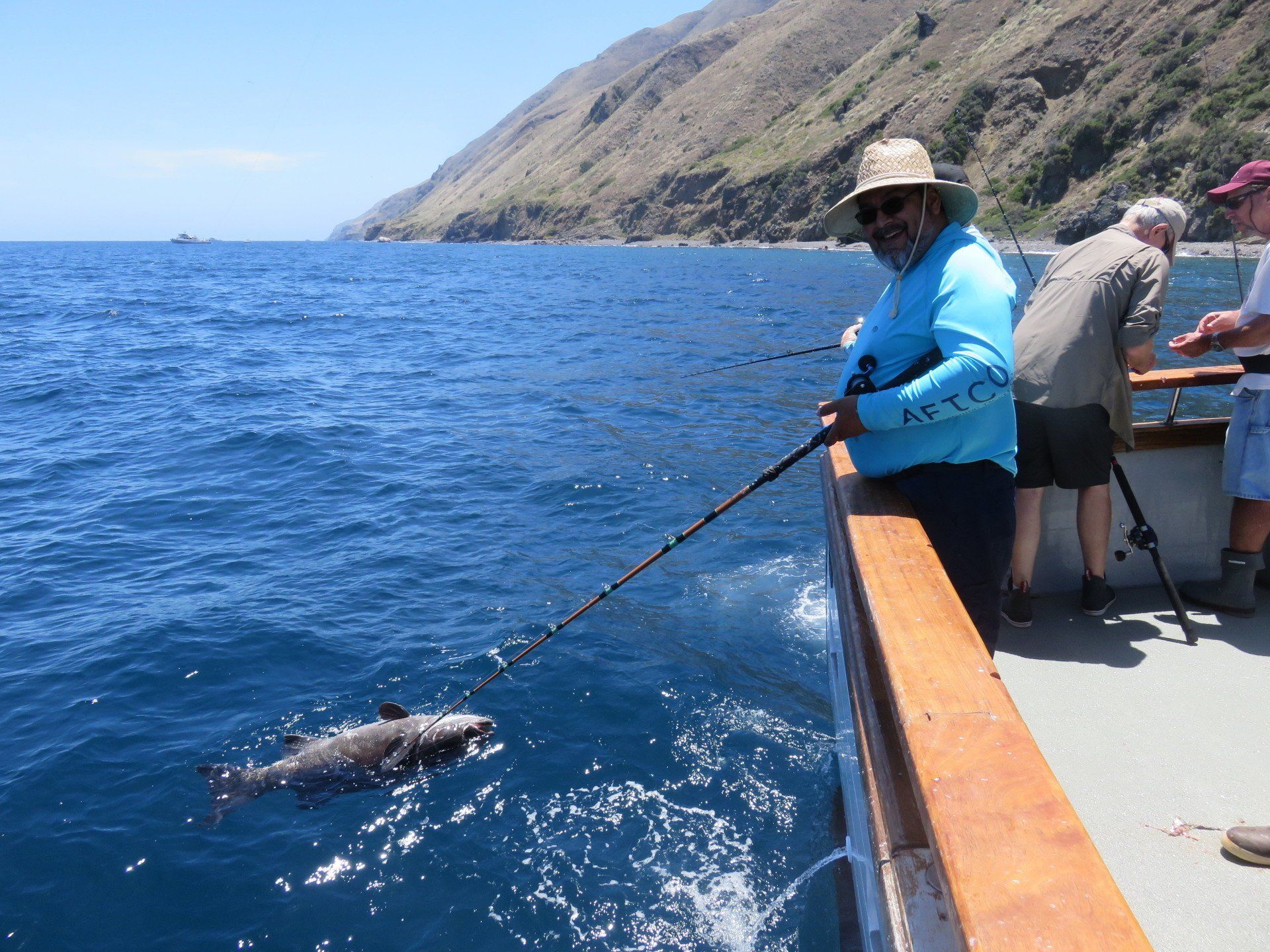 We kept moving up the front side of the island, fishing bass in various spots. One spot we were in real tight, and the boat kept moving closer and closer to the island. After two attempts to lay us close to the island and both times having us so close we would have ran aground, Jeff decided we needed to move on to a new location. Further up the island we kept finding great bass fishing spots, with another 20 or so yellowtail mixed in. Paul happened to hooked a smaller yellowtail, which was then in turn eaten by something much larger and his line started screaming off his reel. After about a 30 minute battle up came a (estimated) 100 lb Black Sea Bass. A beautiful fish, which was successfully released.