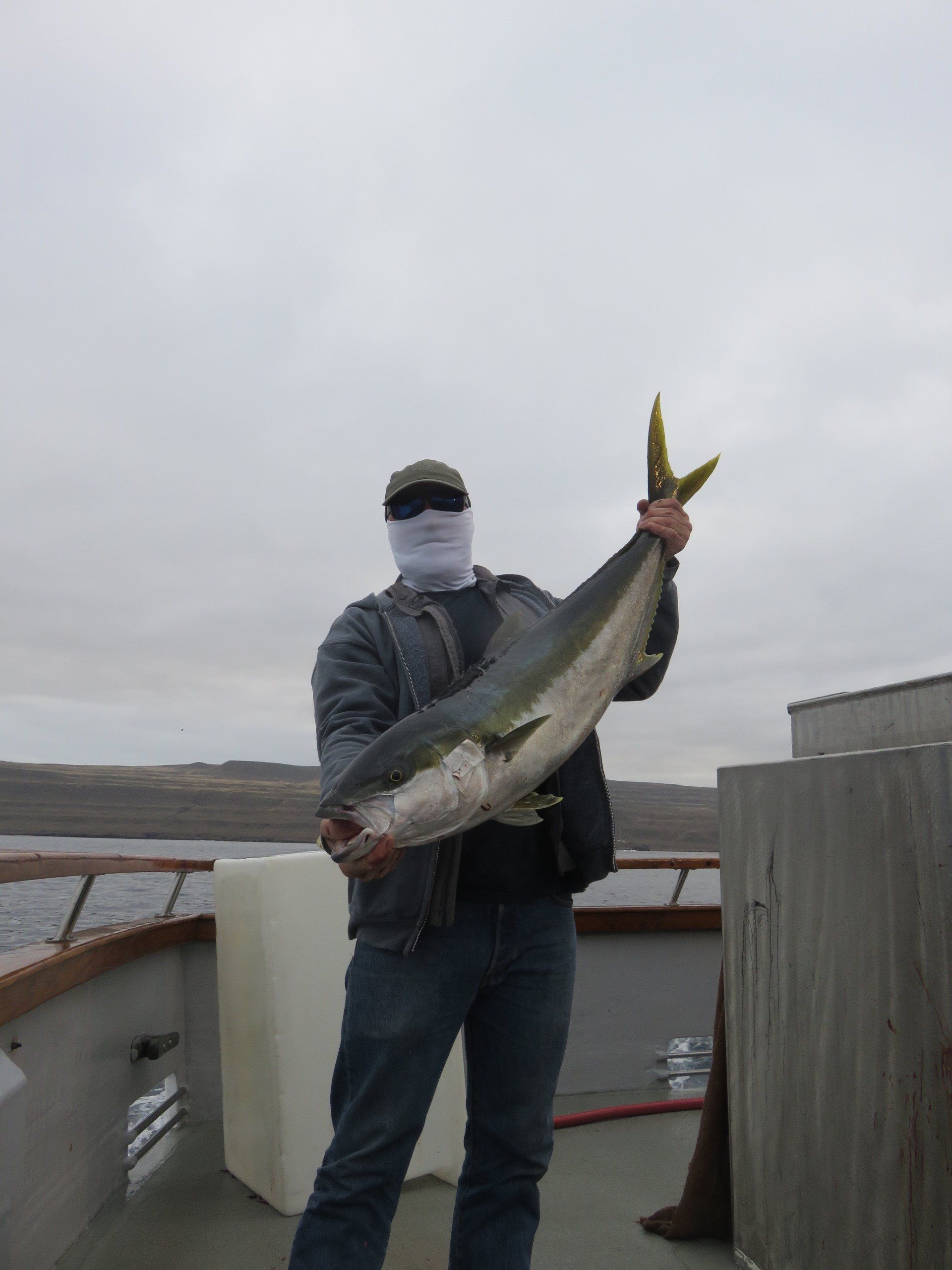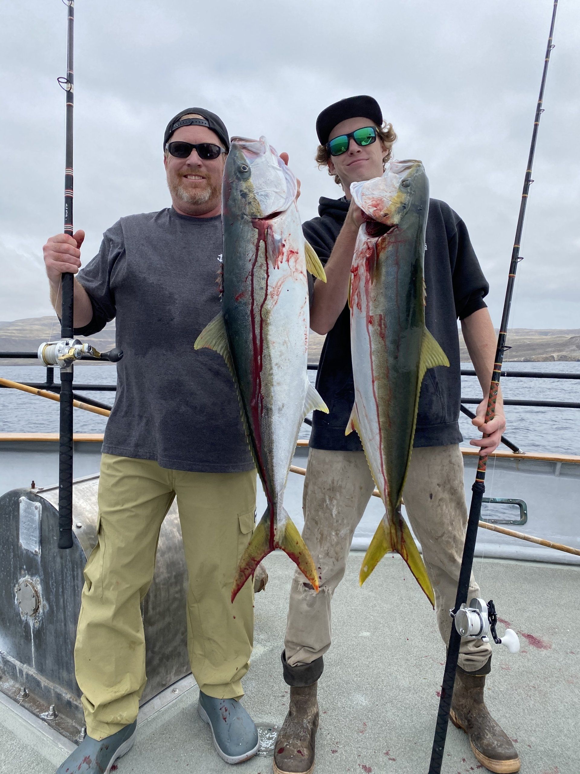 Two men on a boat hold up a large yellowtail fish with a mountainous background.