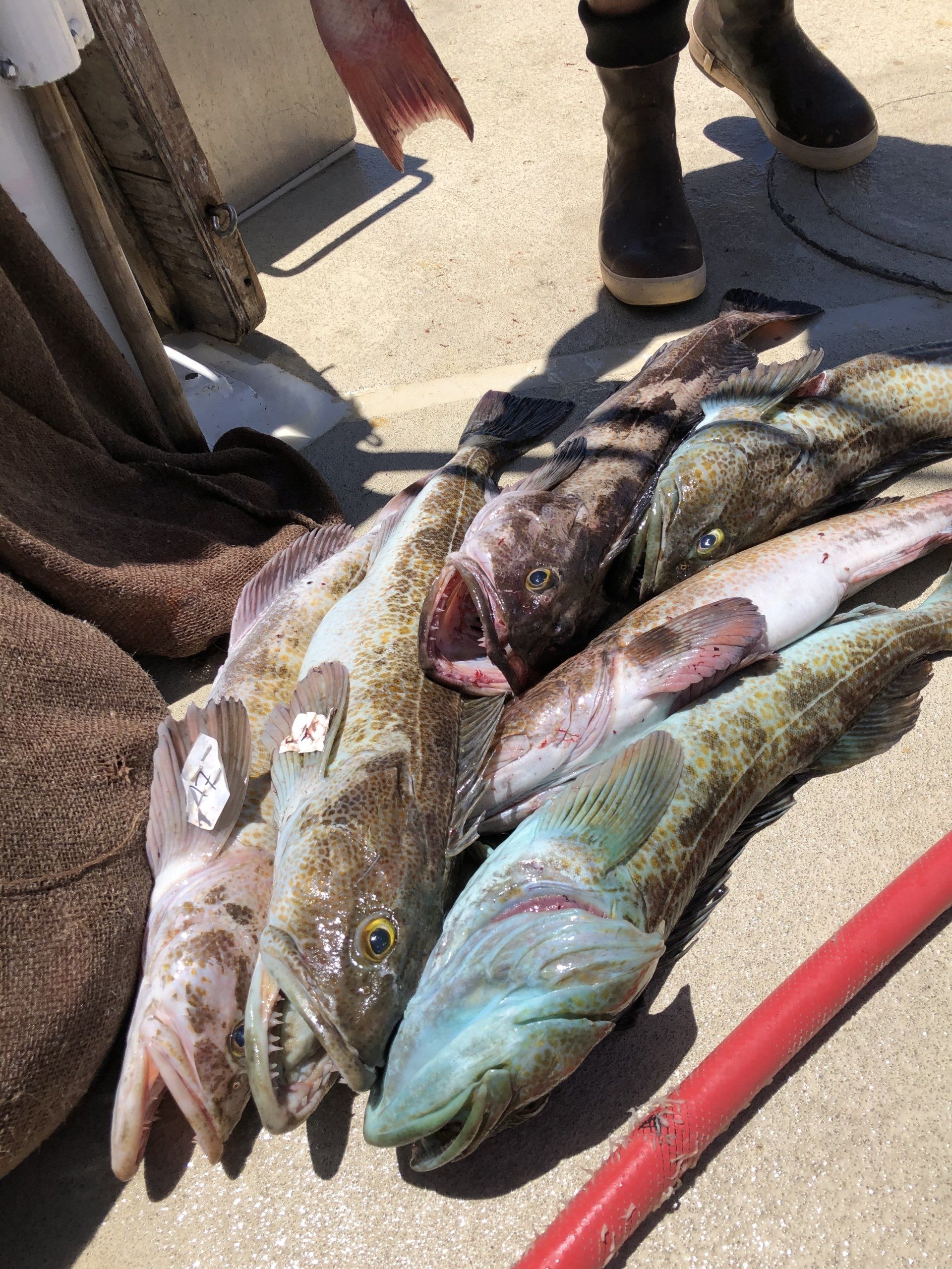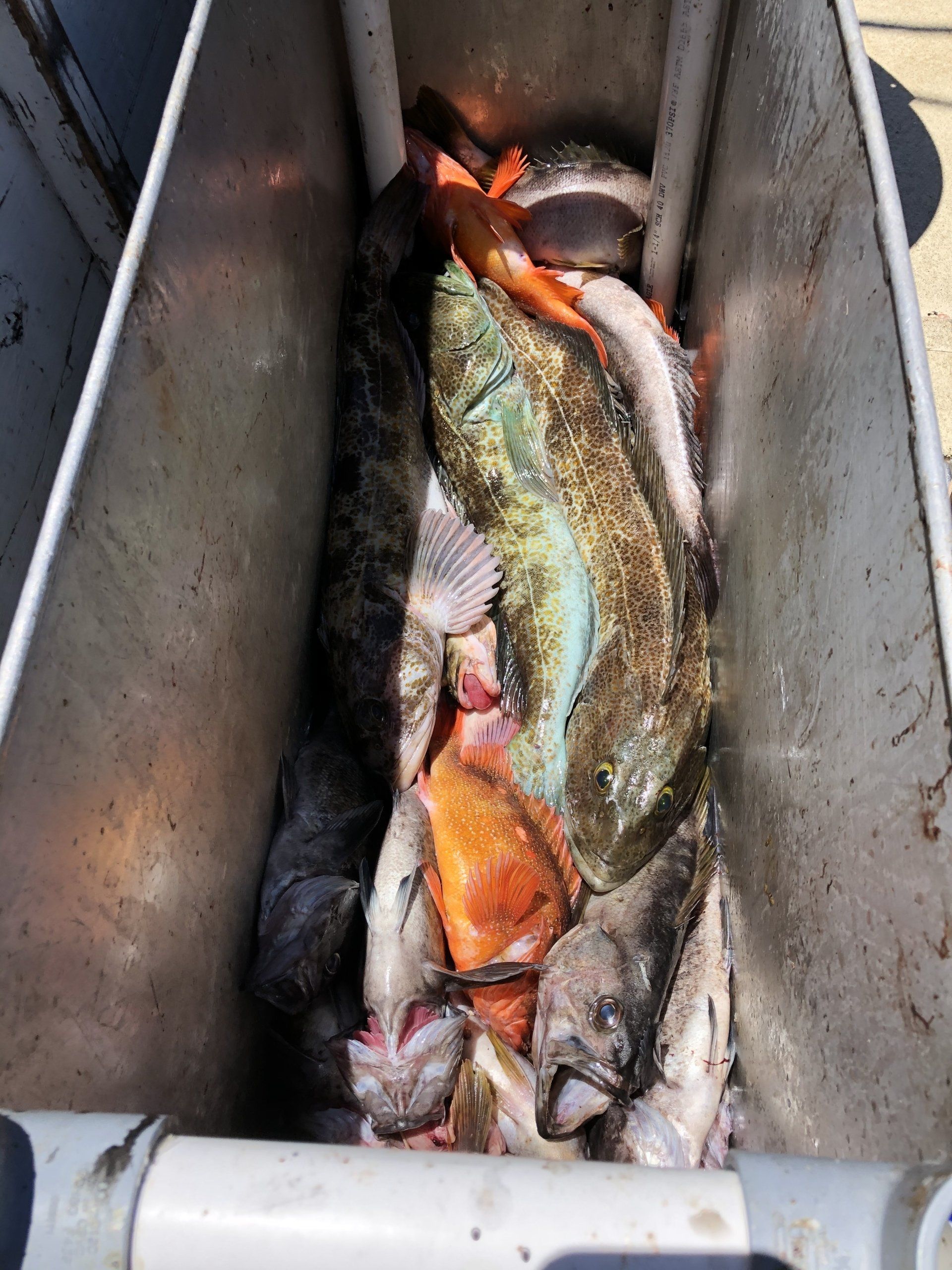 We woke up to very calm seas at San Nicholas Island with what appeared to be plenty of squid, and really nicely cured sardines. The routine was going to be to sit and wait for the White sea bass to come through, the current was running well. They just didn't show for us. Mike Allen was the first to hook up a Yellow Tail. Throughout the day we put on six more yellowtail and had a nice round of Rockfish and about a dozen lingcod. Fishing was on the slow side. But most everyone stayed on deck and fished really hard throughout the day. Around 4 p.m. Bruce tried to pull the hook but as soon as he fired up the engines, Tommy Hill got bit, we wait another 15 minutes, fires up the engines again, Oscar gets bit, wait another 15 minutes, fires the engines again, Luke is on. Oscar and Luke both got their fish.