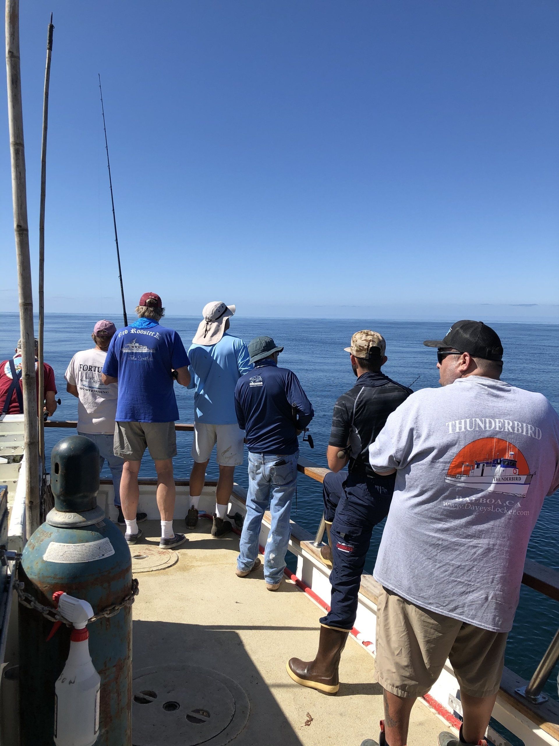 Trip #8: Boat: Thunderbird 1.5 day Departs: Thursday, October 2th Fishing: October 3th, 4th Returns: October 4th pm Thunderbird Crew: Capt. Jeff Capt. Chris Jose Nate Goofy Cast of Characters: Bill Parks Steve Morgan Riley Dyer Jim Bertella Justin Becker Jacob Richards Luke Burson Paul Morgan Mike Allen (Scribe) Patrick Thunyakij Bruce Granse Kevon Kong Michael Harris Ryan Burson Oscar Ochoa Ed Chutney Jeff Allen Andrew Ron Shrout Murphy Parks Romeo Ochoa James Harris Ozzie Baktiari Arriving for a trip in the month of October at Newport Landing is a far easier experience then one would have in the summer months of June – September. The dread of driving through the neighborhood in hopes of an empty space large enough to accommodate the larger trucks that many of the club members own seems to dissipate as the offerings are far more plentiful. While the welcomed views of summer also tend to be less abundant, the ensemble of club members arrived with plenty of time to catch-up on some conversations and enjoy a beverage or two.