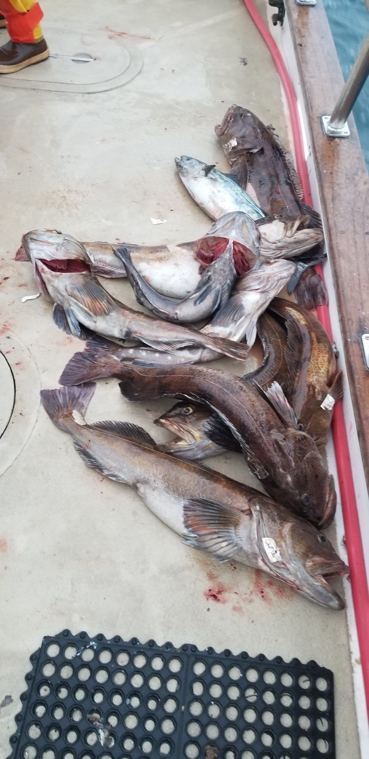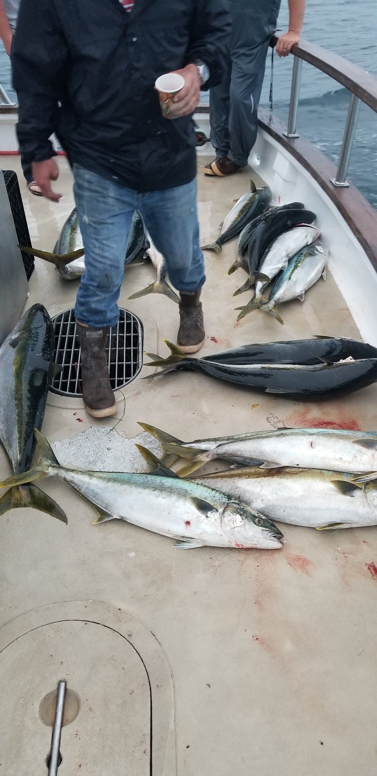 A boat deck with a large haul of various fish, including tuna, after a fishing trip.