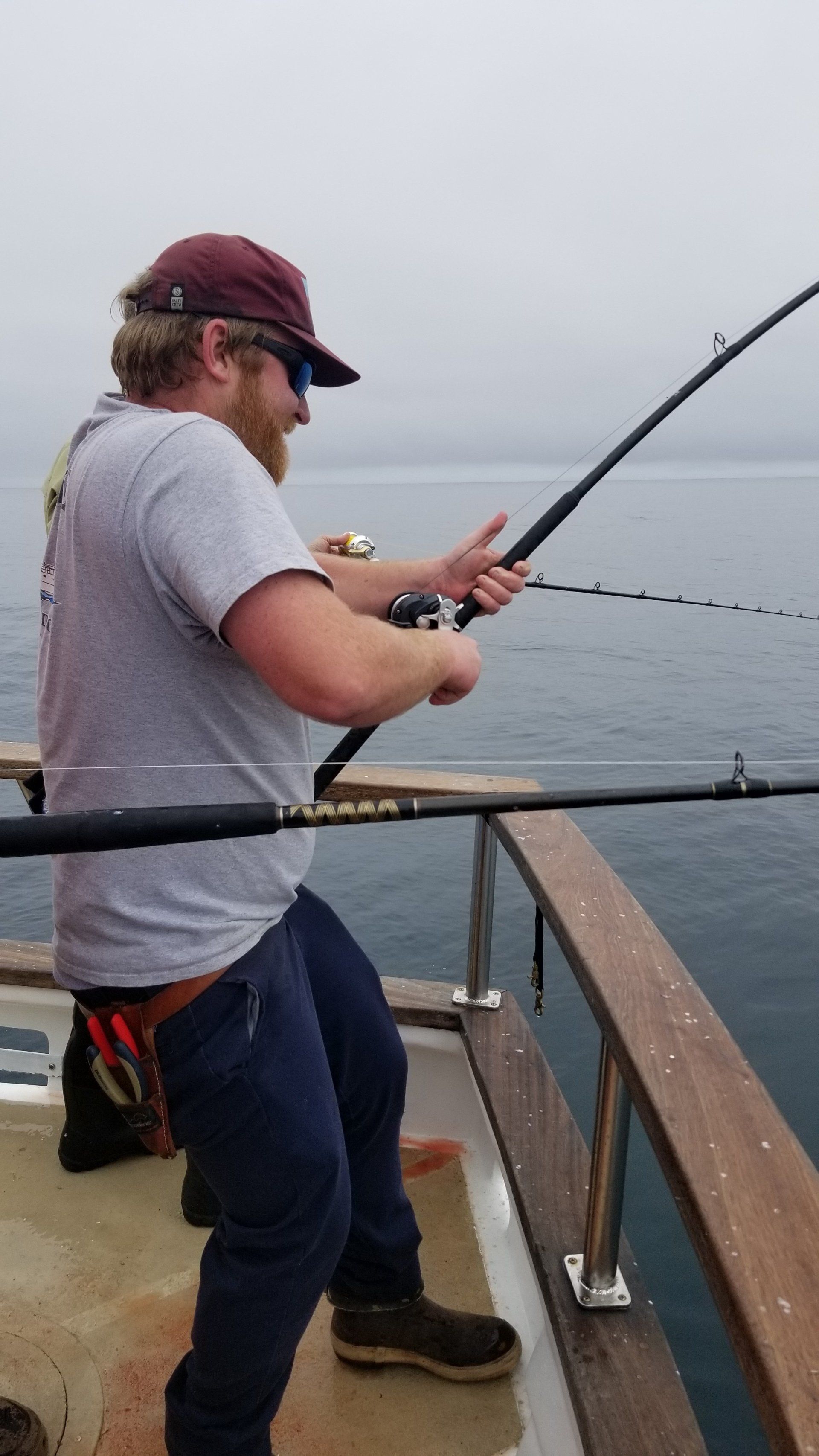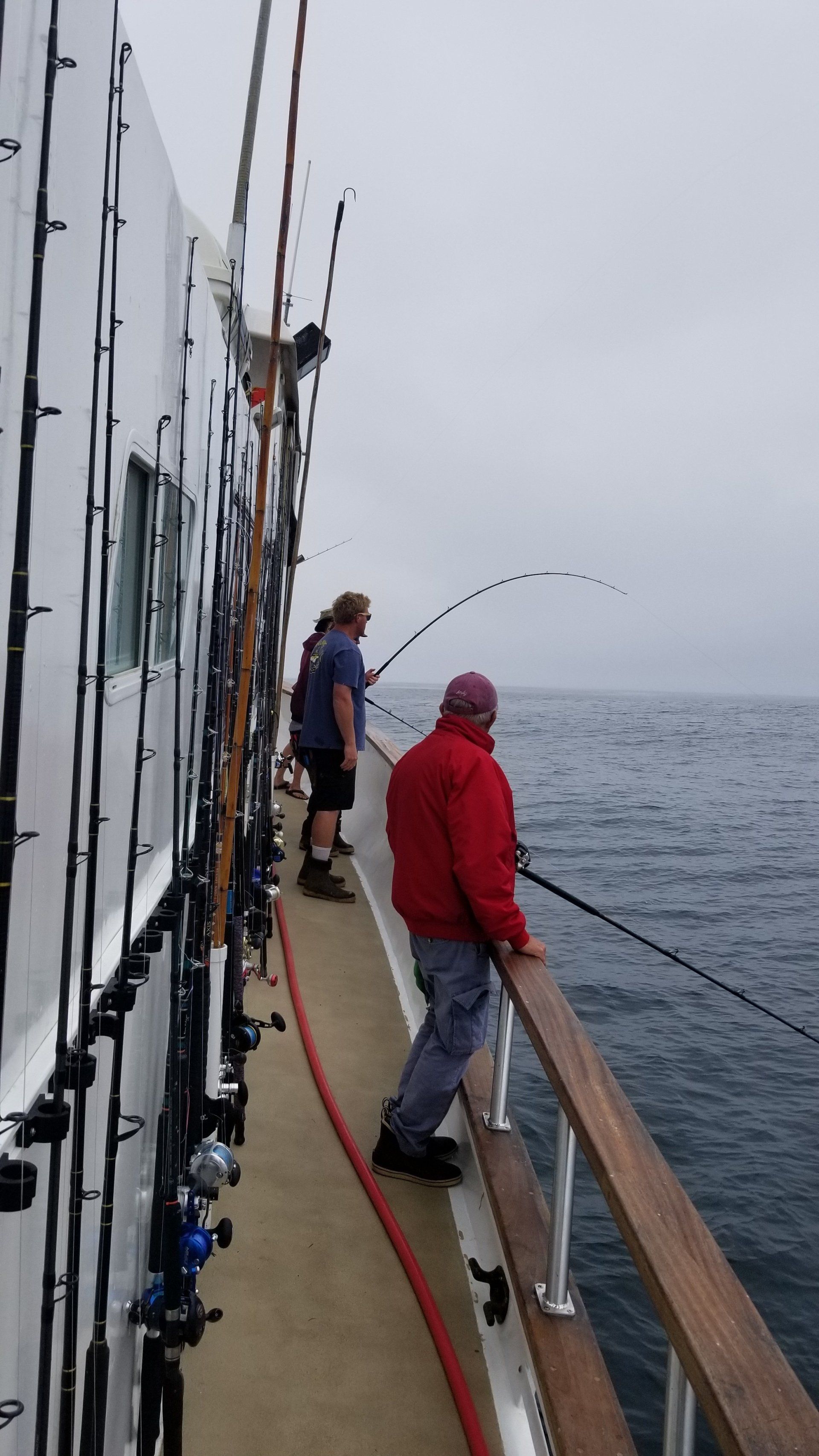Trip #4: Boat: Thunderbird 2 day Departs: Thursday August 7th Fishing: August 8th, 9th Returns: August 9th pm Trip 4 started as usual with people arriving at Newport Landing at all hours of the day with anticipation of fishing. The preliminary reports from Gary Thompson were all too familiar to what we’ve seen this year. Bait was going to be an issue. And last but not least, was the fish seemed to pop up one day and then disappear the next. Nevertheless, everyone was ready to go. Friday morning saw us anchored at the usual cove off SCI. Weather was OK; fishable, but not a lot of fish. But the ones we caught were quality yellowtail and white sea bass. The sea lions provided ample entertainment …err I mean frustration. We hopped around to a few spots picking up the occasional calico but not much. Day 1 jackpot went to Alex Arthur (Justin Becker’s Guest) with the patch going to Nick Burson for some chunky YT’s Day 2 started much as it did Day 1 but the weather was worse than Day 1. We looked here and there with only 3 yellowtail to show for our efforts. Eventually, the Thunderbird turned towards offshore waters to try our luck at some bluefin. Unfortunately, the fish didn’t get the memo and we saw neither sign or had any bites. Mr, “Hey that’s my fish” Tom Hill was the lucky jackpot and patch winner for Day 2 with a 15# YT. So, there you have it, not a, “Hey you missed a great trip” kind ‘a trip but per usual, the members of our club all seemed to enjoy doing what we do. It’s not always about the fish; it’s about the people and the experience. LOL! Who am I kidding…we all want more fish. Until next time, step to the right/left and take up your slack.