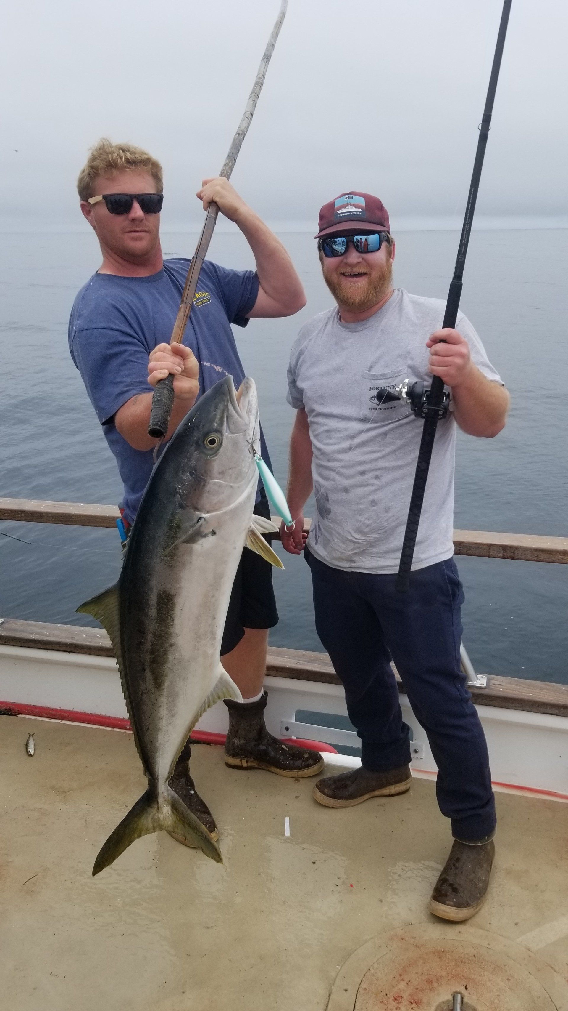 After a beautiful night cruise with no swell, we arrive at Cortez and lines go out at 6am. Chef Tommy prepared delicious breakfast burritos to get us fueled. Mario Jr. lands the first yellow on the jig. He proceeds to put a jig clinic the rest of the day and finishes the day with 5 yellows. Jake also became a multi fish winner getting 2 of his own on the jig. The two kids caught half the haul. Very impressive. Mario reminds me of the Bratt Pitt fly fishing role in the movie A River Runs Through It. His skill at getting bit and tossing the jig is unmatched. A sight to see. Second Captain Sean, threw a jig on his 10-foot Seeker Ulua and proceeded to destroy a 40 lb class yellow. I swear it took him 5 minutes. What a beast... My friend and new member Justin took first day big stick honor making history as the first member to get a patch on his first official trip with a 30 lb yellow. Congrats Justin! We ended up landing 14 quality yellowtail on the first day after a good number of casualties with yellows spitting the jig. The conditions were tough for bait fishing, as we had very little current and flat water.