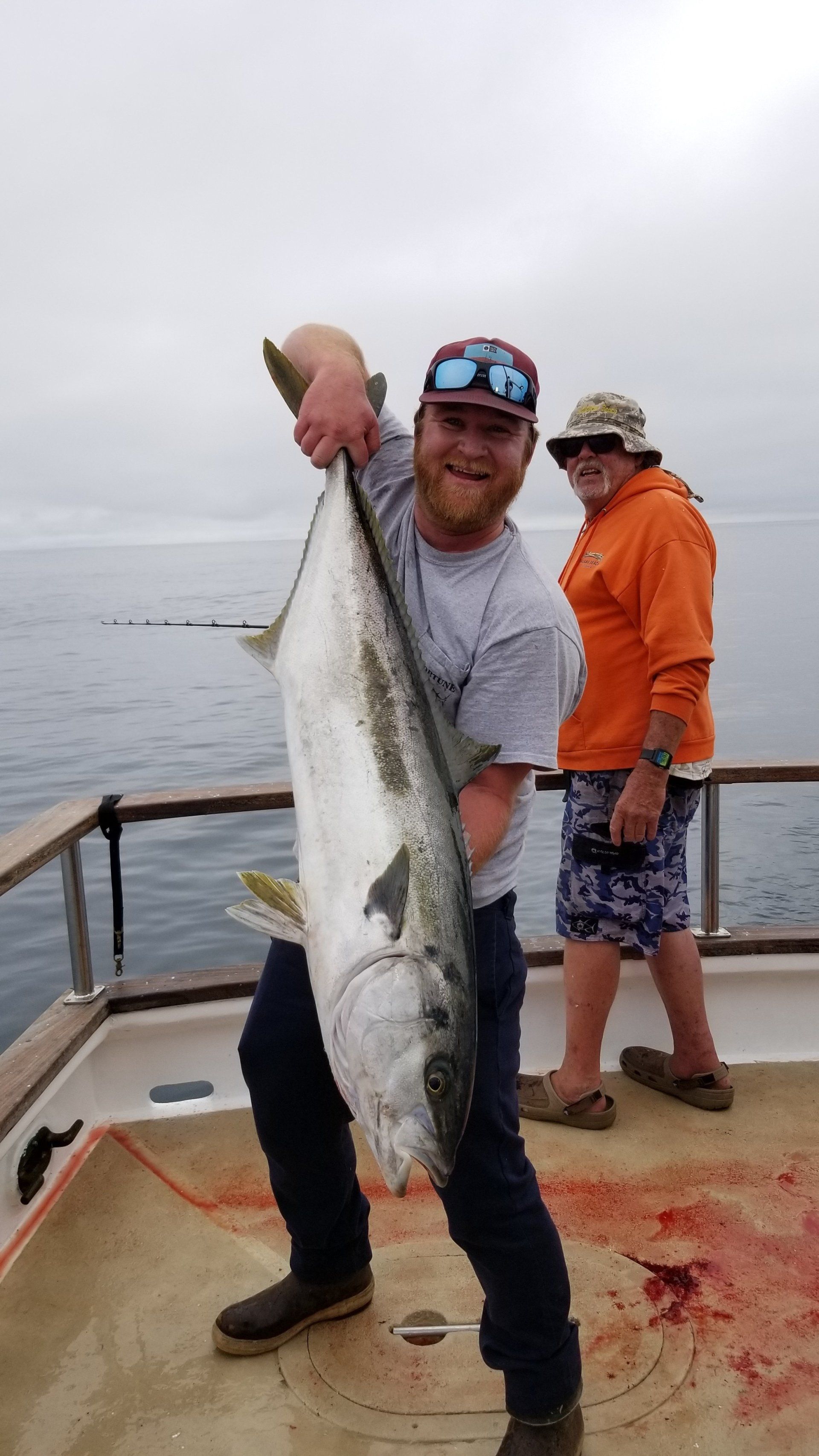 Two men on a boat hold up a large yellowtail fish with a mountainous background.