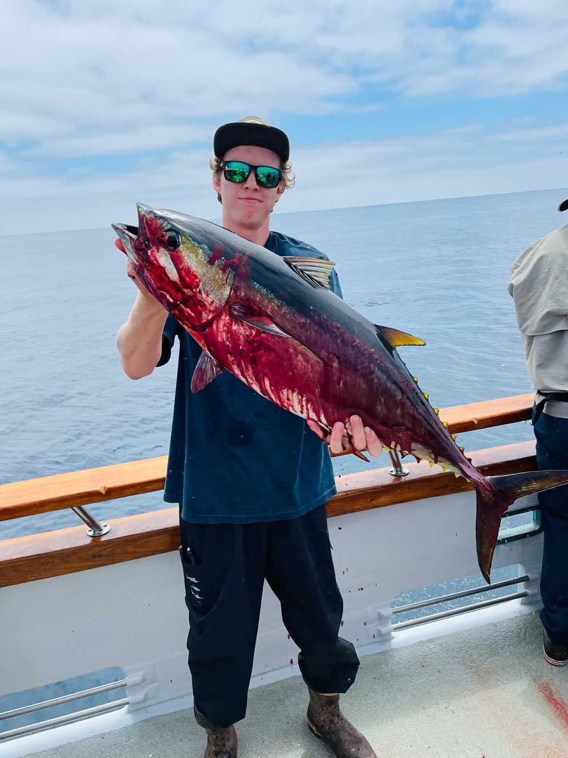 Cody is bit on 20lb test line, and the fight takes longer than he wishes, but in the end he boats a 15lb yellowfin tuna. With no more bait, and just a 2 ½ hours to the dock, our trip ends at 5pm.
