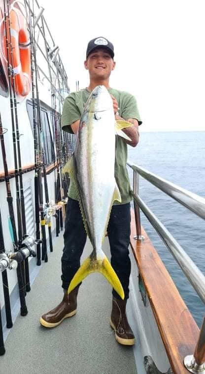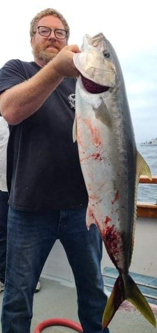 We decide to make a move, and picked at a few more YT. Captain Jeff decided to move the boat back to the other side of Pyramid head later in the afternoon, and we landed another 51 YT with some of the hookups getting rocked just like before. Again, these were quality fish. Roy landed one that topped the scale at 34.8lbs, and we thought it would be the jackpot winner, until member Jeff gets picked up and lands a YT weighing 35.5 lbs on the scale, and measured 44” long and 24 ¼” girth, calculated 32.4lbs. This wins the jackpot for the day and also earns Jeff a patch for Day 1.