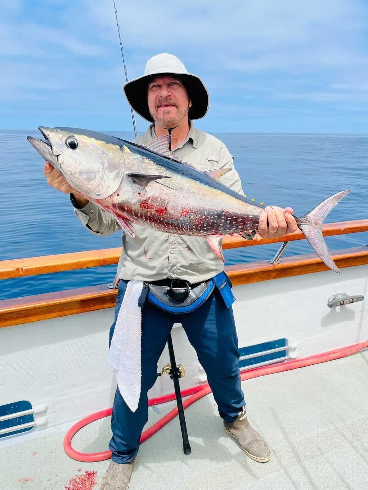 At 1:30pm, Captain Jeff, surprises us with a decision to take our last 4 scoops of bait to see if we can pick up some BF tuna. We start motoring towards the southeast side of Catalina Island to see if we can find some foamers. After two hours, we run into the fleet of 15-20 boats trolling an area with marks of BF. We see a couple jumpers, so we toss some of the bait left in the tank to see if we can bring them to the boat. On one of the stops, Jeff and Nick pick up BF which are estimated to be about 20-22lbs. Luke had one at the boat, but it rolls and saws him off before Captain Jeff can get a gaff into him.
