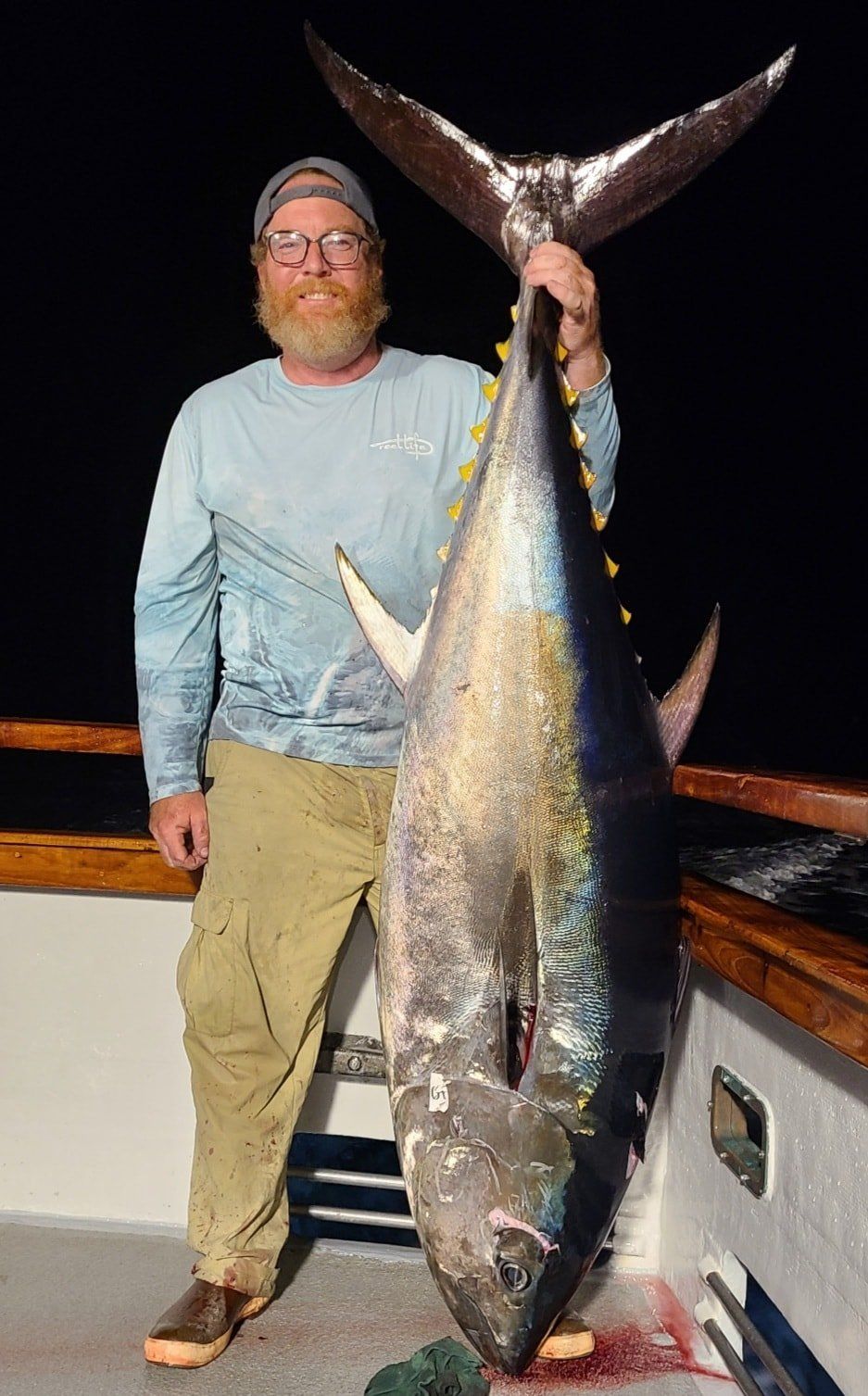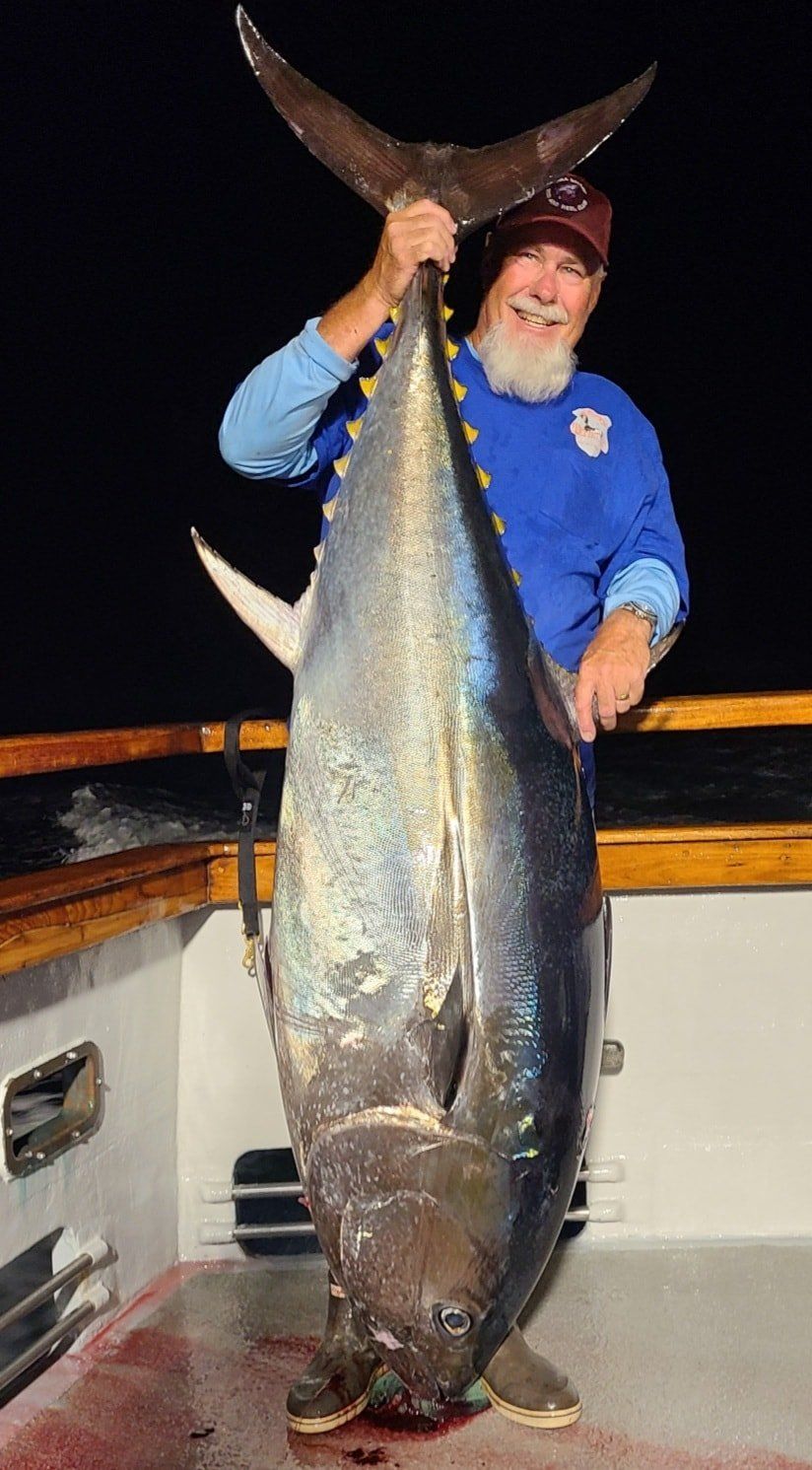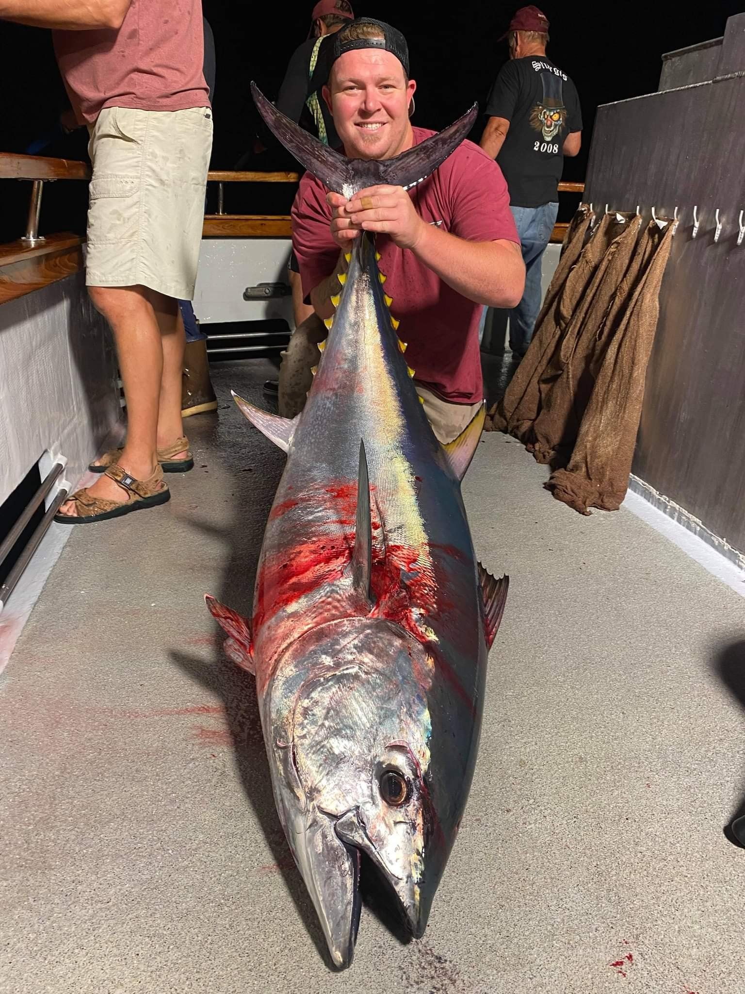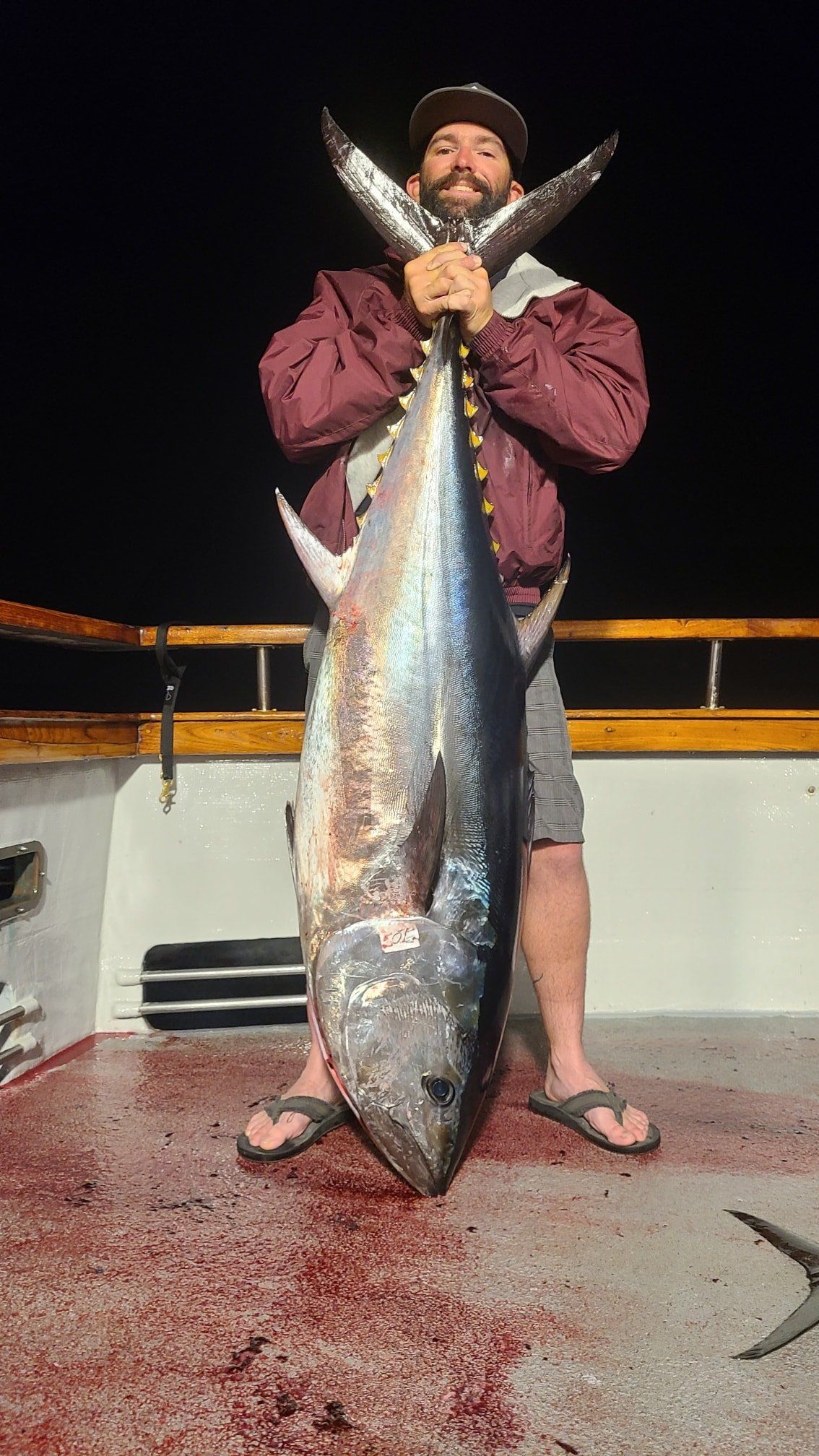 We got to the West End of SCI about 7:00pm and started looking around. There hadn’t been much large Bluefin seen lately and most of us were thinking we would get in early, when at 9:15 we stop on some meter marks. Dropping flat falls and knife jigs down to 180’ to 300’ to the fish 5 Bluefin from about 70# up to about 130# were landed. Then some bigger models moved in and 5 more were multi-gaffed by the crew. These fish were from 107# to 210#