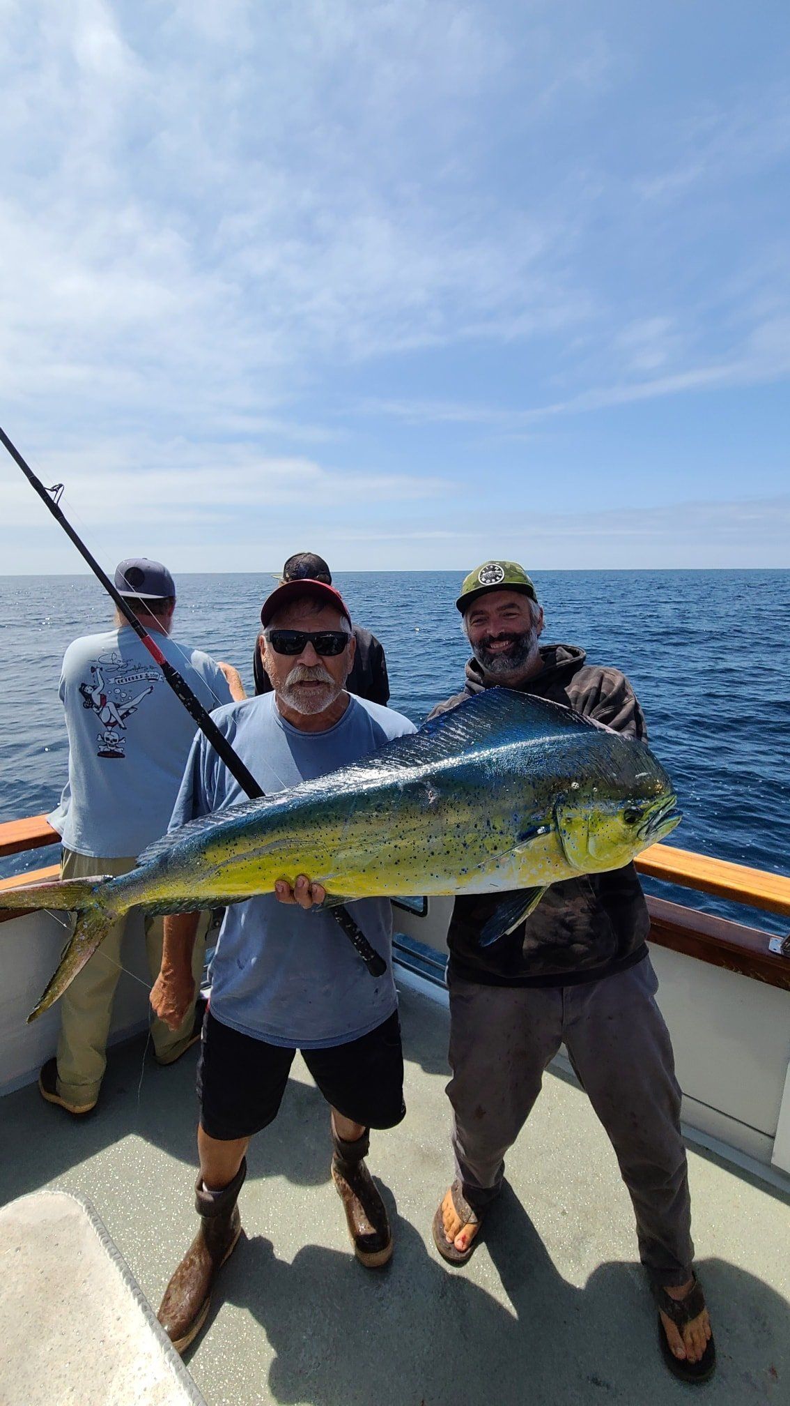 We were near the Butterfly Bank by 5:00pm when Happy Hour started. Oscar, who had been on the gyros most of the day, spotted a huge kelp. Jeff set us up for a drift passed it and chaos ensued with most everyone hooked up at once. 43 Dorado were landed with some losses due to angler errors and the frenetic swimming of those fish. We made another drift on the kelp for only one stupid Dorado. So, 44 dorado were added to our day’s total. By 6:00pm we were almost to the Mushroom Bank and hit another kelp for 14 more Dorado. Some nice ones in this bunch. Up to about 20#. That was it for Day one. Good fishing with terrific weather. Calm seas and nearly windless all day.