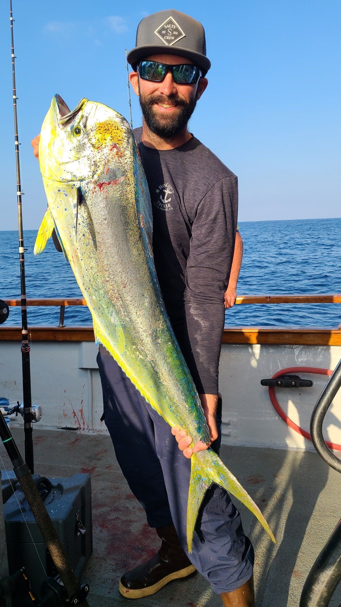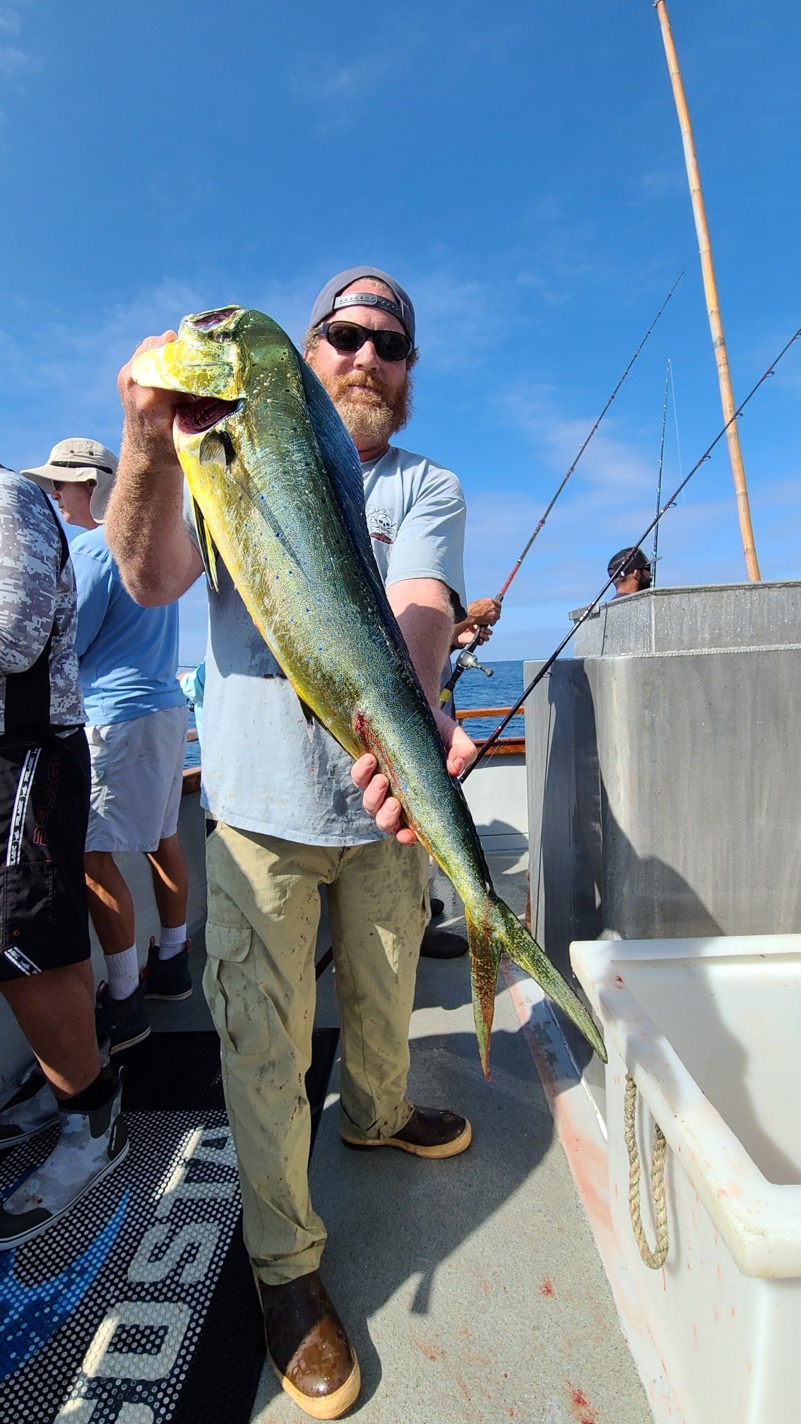 About 9:00am we pulled anchor and started SW looking for kelp paddies and what they may hold. Only about 15 minutes later we find one and pulled 5 Dorado onboard. Not big fish, but not Doritos either. The day was looking pretty good. Already three gamefish species and it’s still early. Three hours later, we’ve seen a lot of empty kelps. Tom Hill coaxed one Dorado onto his hook only to get bit off. Over the next we added two more Do-Do’s to the count and two tiny Blue Sharks. Lots of empty kelps and two hours later, Jeff spots three finning Marlin. He slows and we throw baits to them but they ignored our offerings and sunk out. A few more little Dorado were caught including the reverse Jackpot fish by Luke. A 1 ½# Dorito.
