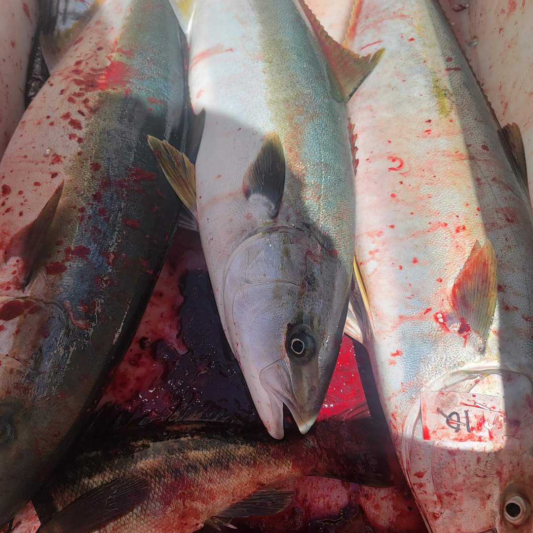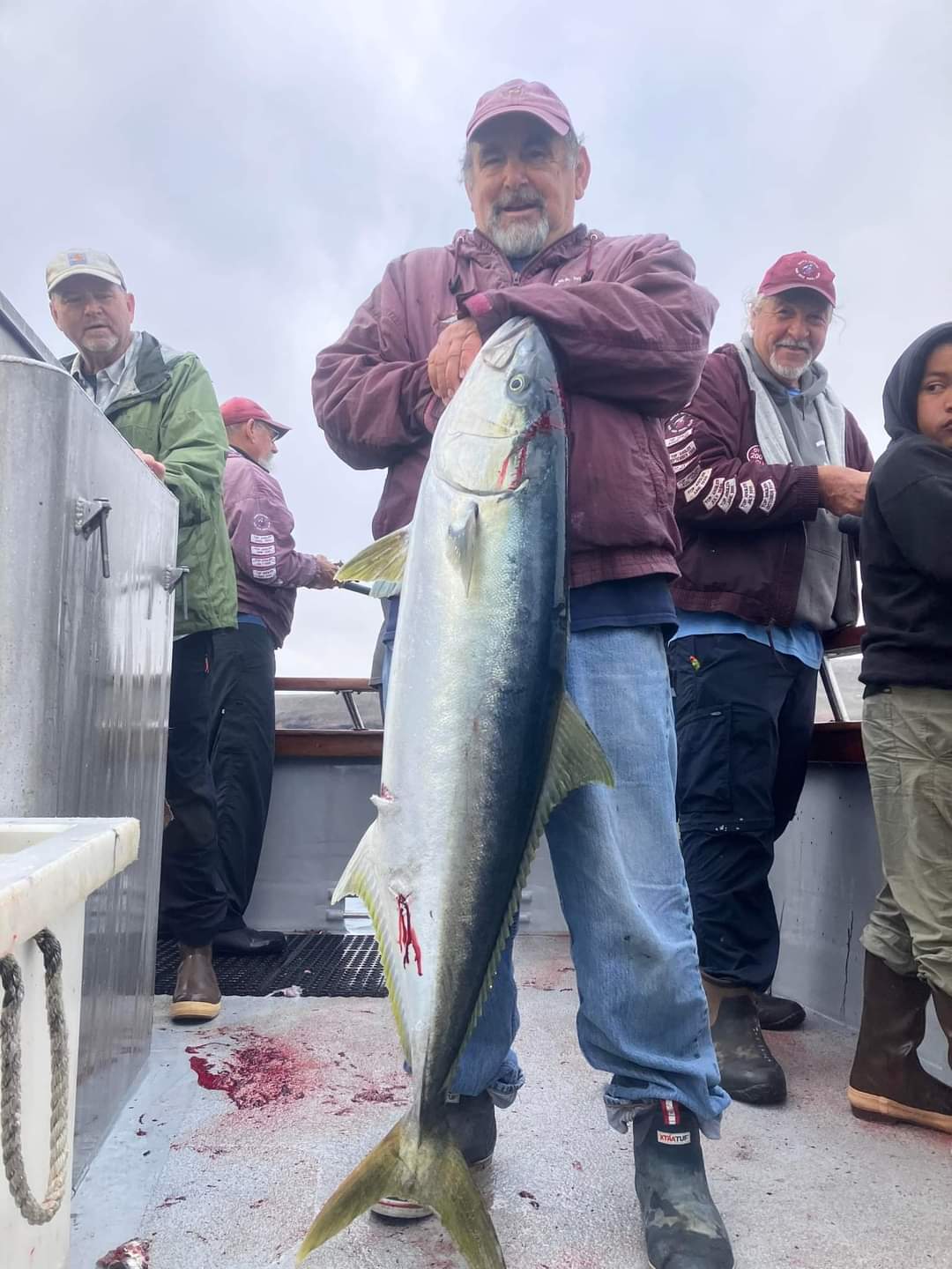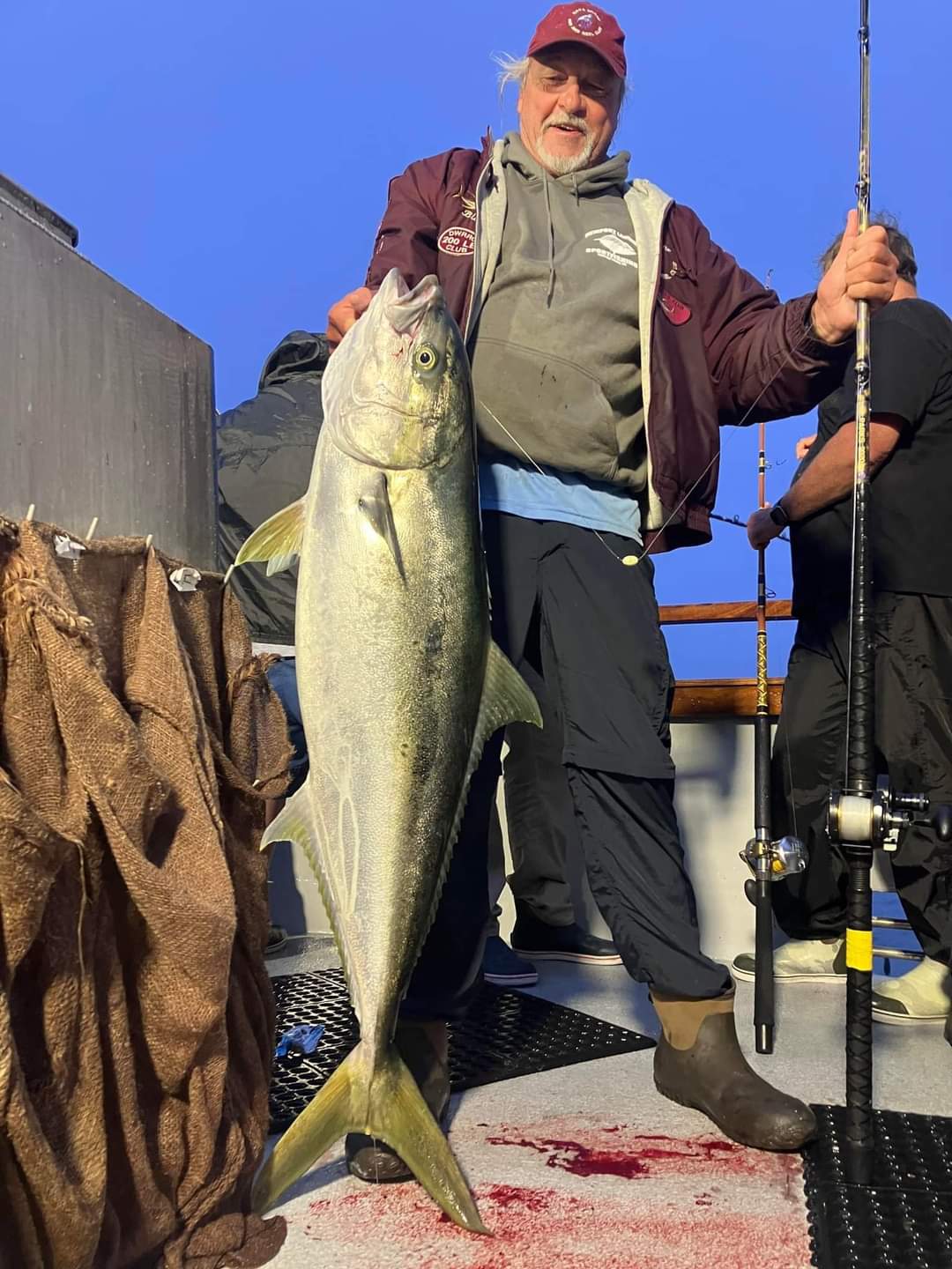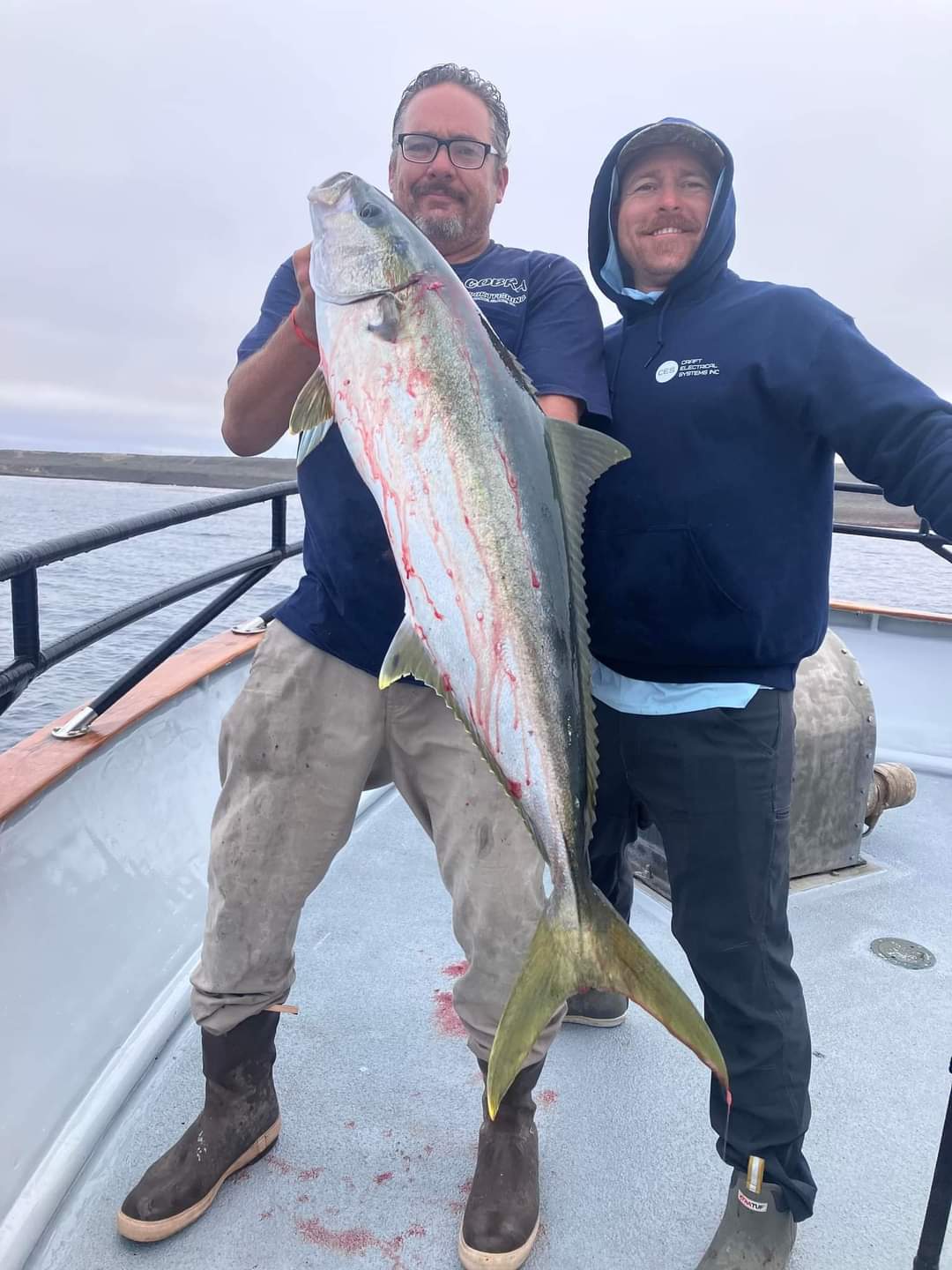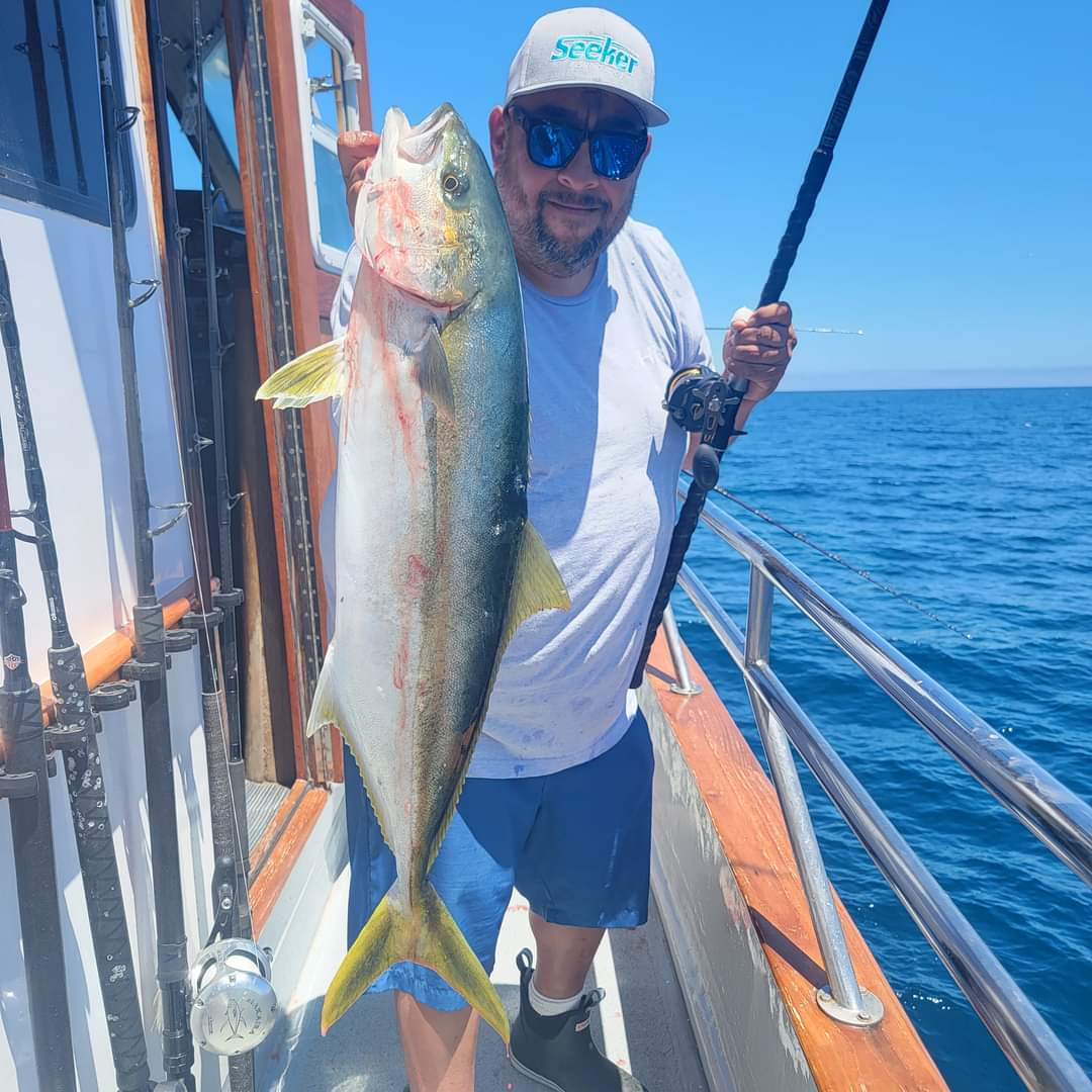 Fish On! Yellow Tail on the boat at 4:45 AM by Chris, the night Captain. The call to the group went out and everyone scrambled to get a line in the water. We had live squid on the boat and most fished dropper, egg sinker or lead head.