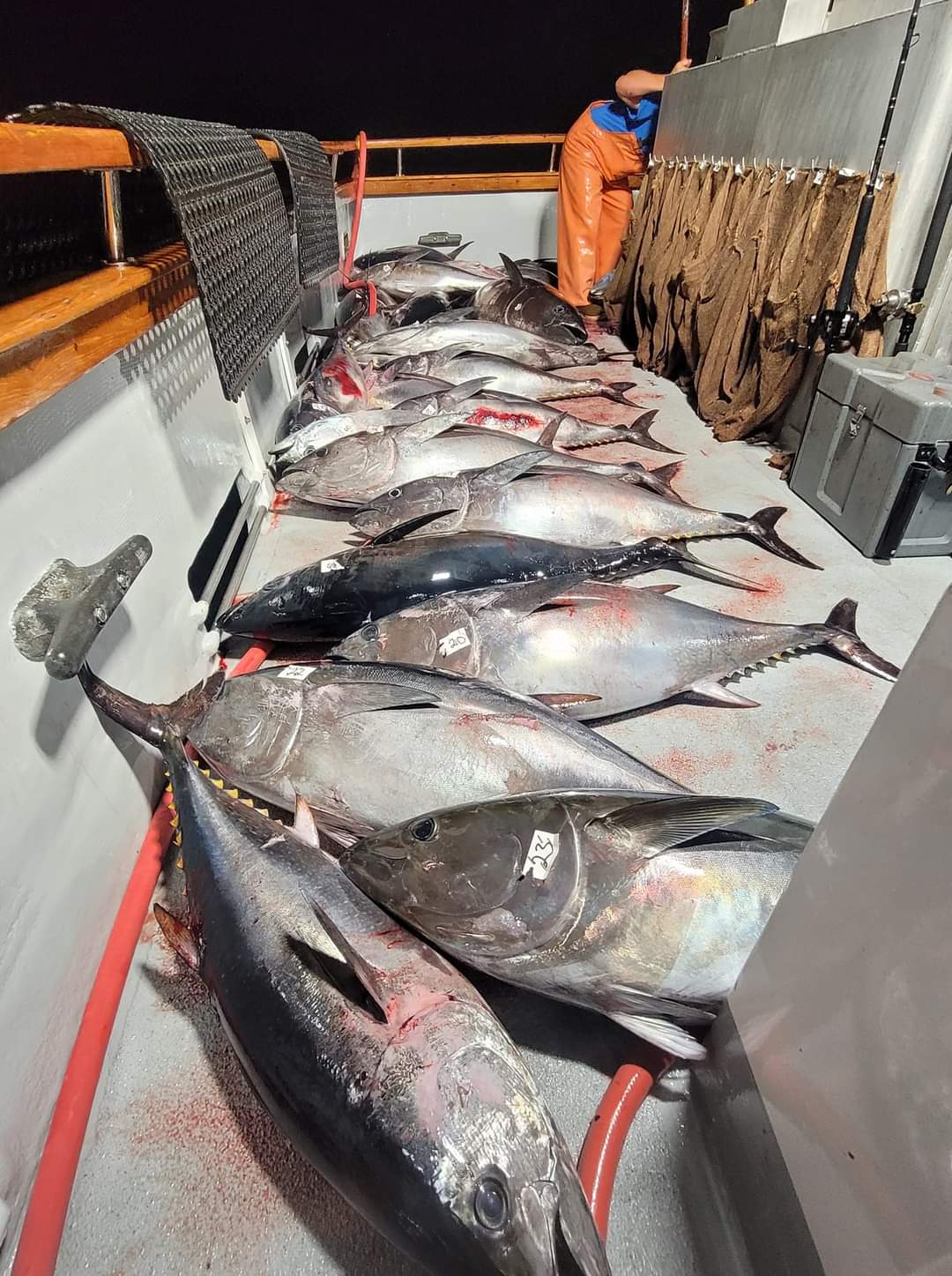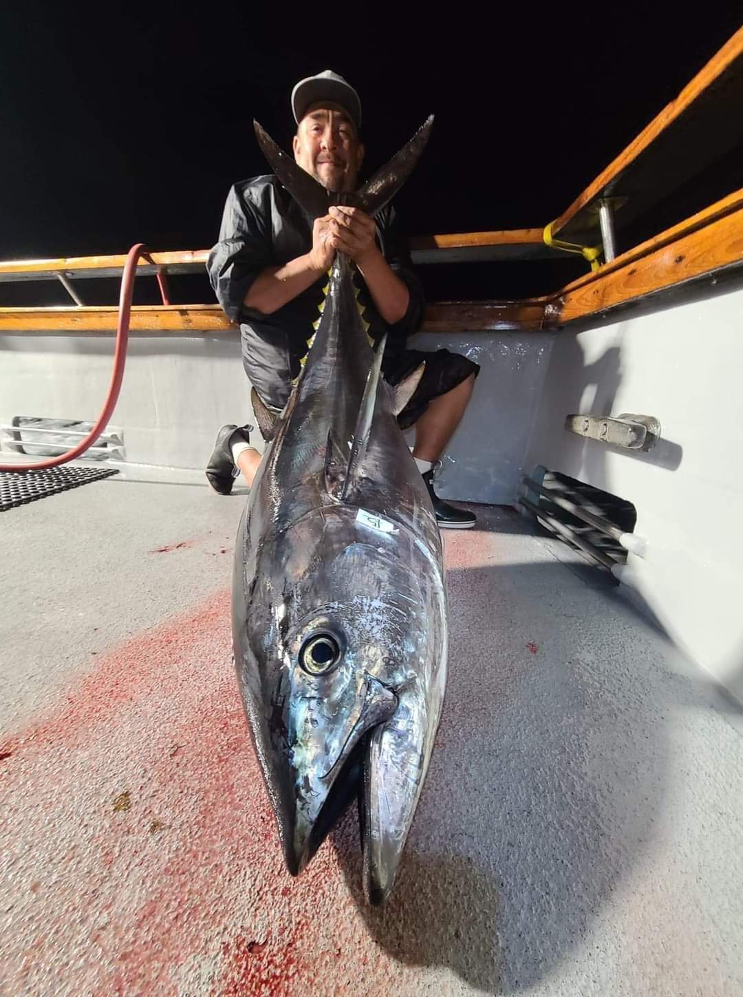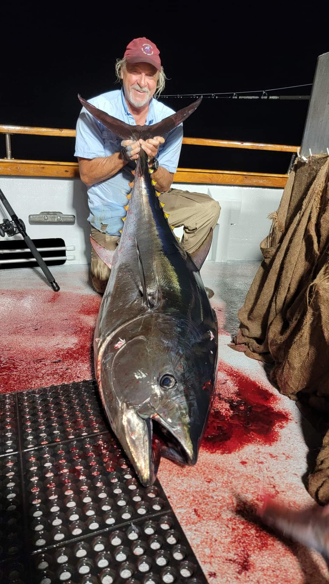 We arrived on scene right on time with about an hour or so before dark and Jeff was doing his thing in the wheelhouse figuring out where these fish were and let me tell you it did not take long. We had stopped on a couple school before dark that didn’t bite, but shortly after dinner and now the sun down Jeff found some very eager fish. Around 8pm these fish decided to let their guard down. “BITERRRRRR” as the first fish was hooked for the rest of the night, we had fish hanging. When we moved, we only had to idle for a few minutes at the most before Chris or jeff found another big school. For the entire night we hear them over the PA “They or on us 180-240.” By the time midnight came we had our limits for day one on 70–160-pound fish. Oscar Ochoa and a guest Taylor Rodriguez put on a clinic that night landing 9 fish each helping us out for our daily limit. Another stand out fish was caught by Ian Parkers 83 year old father Nigel. He was at the rail all day and night and he was able to land a beautiful butterball of a bluefin on 50 pound test to boot! As the clock struck midnight the daily jack pot however went to Tim hill on a 100 plus pound fish.