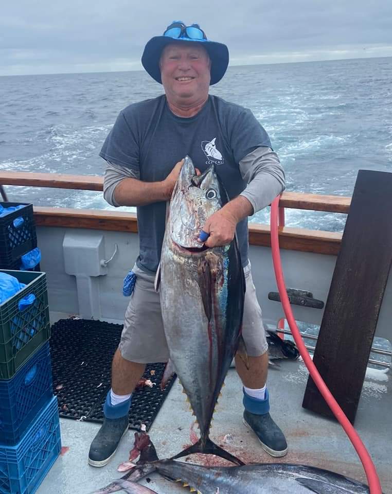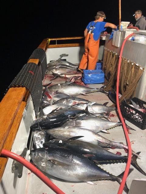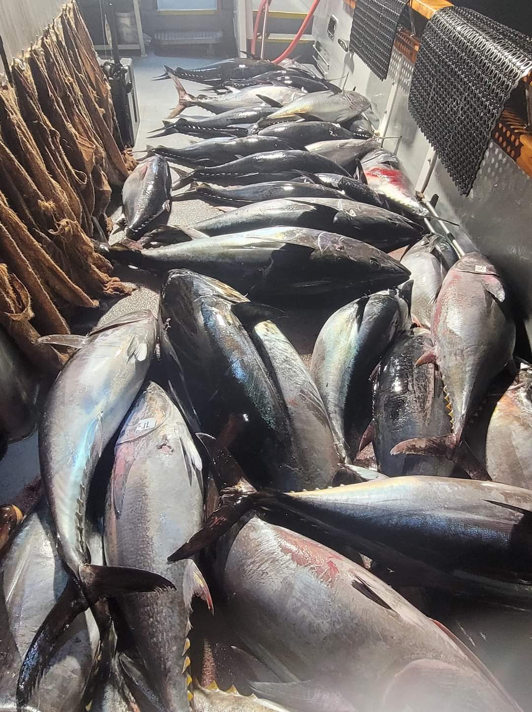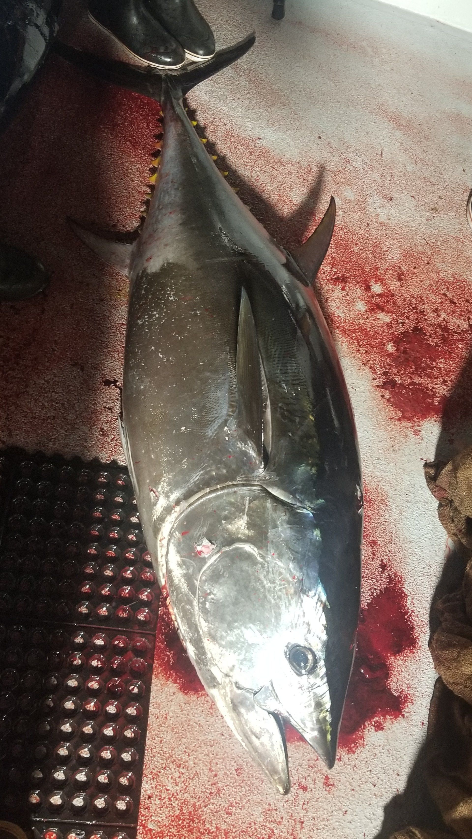 We arrived on scene right on time with about an hour or so before dark and Jeff was doing his thing in the wheelhouse figuring out where these fish were and let me tell you it did not take long. We had stopped on a couple school before dark that didn’t bite, but shortly after dinner and now the sun down Jeff found some very eager fish. Around 8pm these fish decided to let their guard down. “BITERRRRRR” as the first fish was hooked for the rest of the night, we had fish hanging. When we moved, we only had to idle for a few minutes at the most before Chris or jeff found another big school. For the entire night we hear them over the PA “They or on us 180-240.” By the time midnight came we had our limits for day one on 70–160-pound fish. Oscar Ochoa and a guest Taylor Rodriguez put on a clinic that night landing 9 fish each helping us out for our daily limit. Another stand out fish was caught by Ian Parkers 83 year old father Nigel. He was at the rail all day and night and he was able to land a beautiful butterball of a bluefin on 50 pound test to boot! As the clock struck midnight the daily jack pot however went to Tim hill on a 100 plus pound fish.