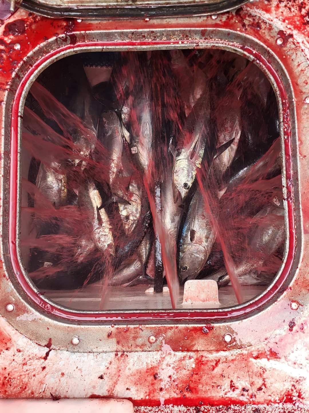 So, 6-packs, by names sake, have 6 people aboard. The bait tank matches that small load. Our Thunderbird holds 25+ people, and the bait tank of the Thunderbird matches that number too, so off Scuba goes and starts chumming this school and the BITE IS ON!
