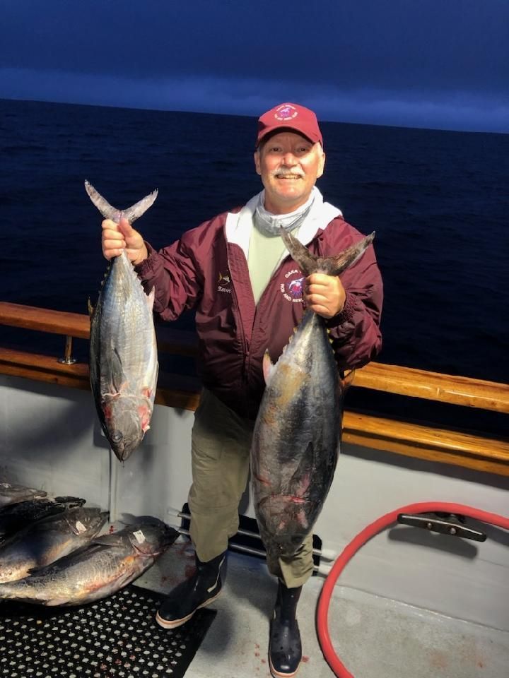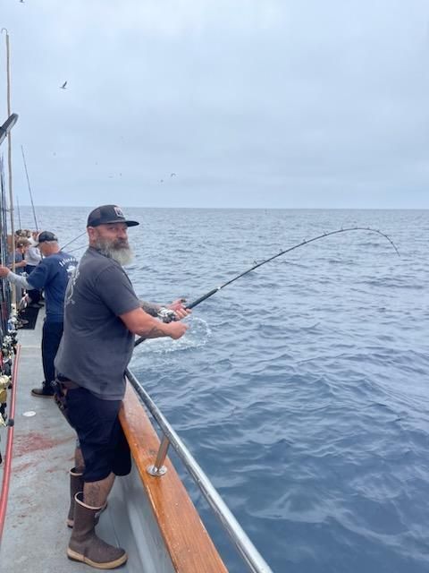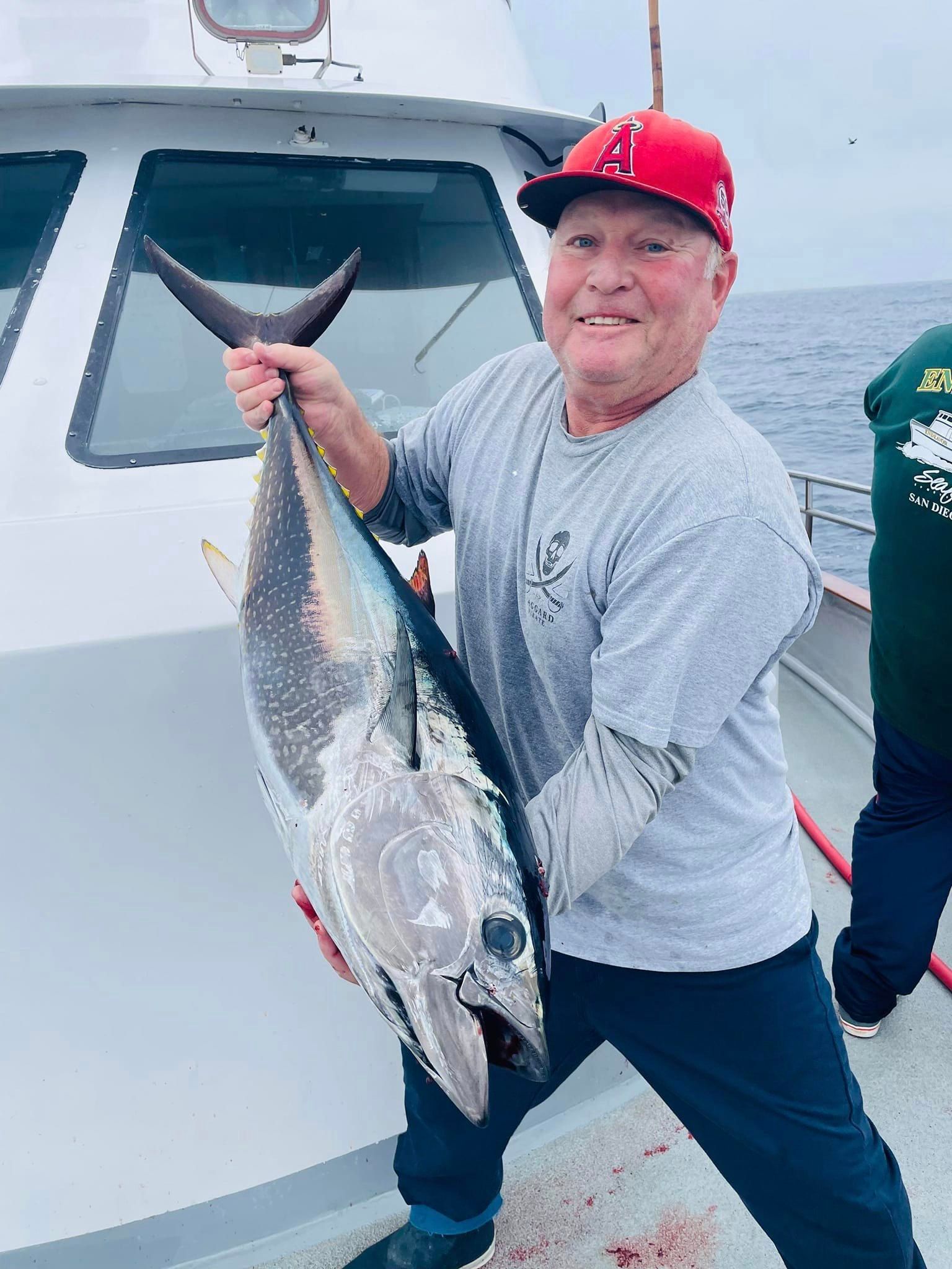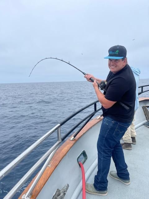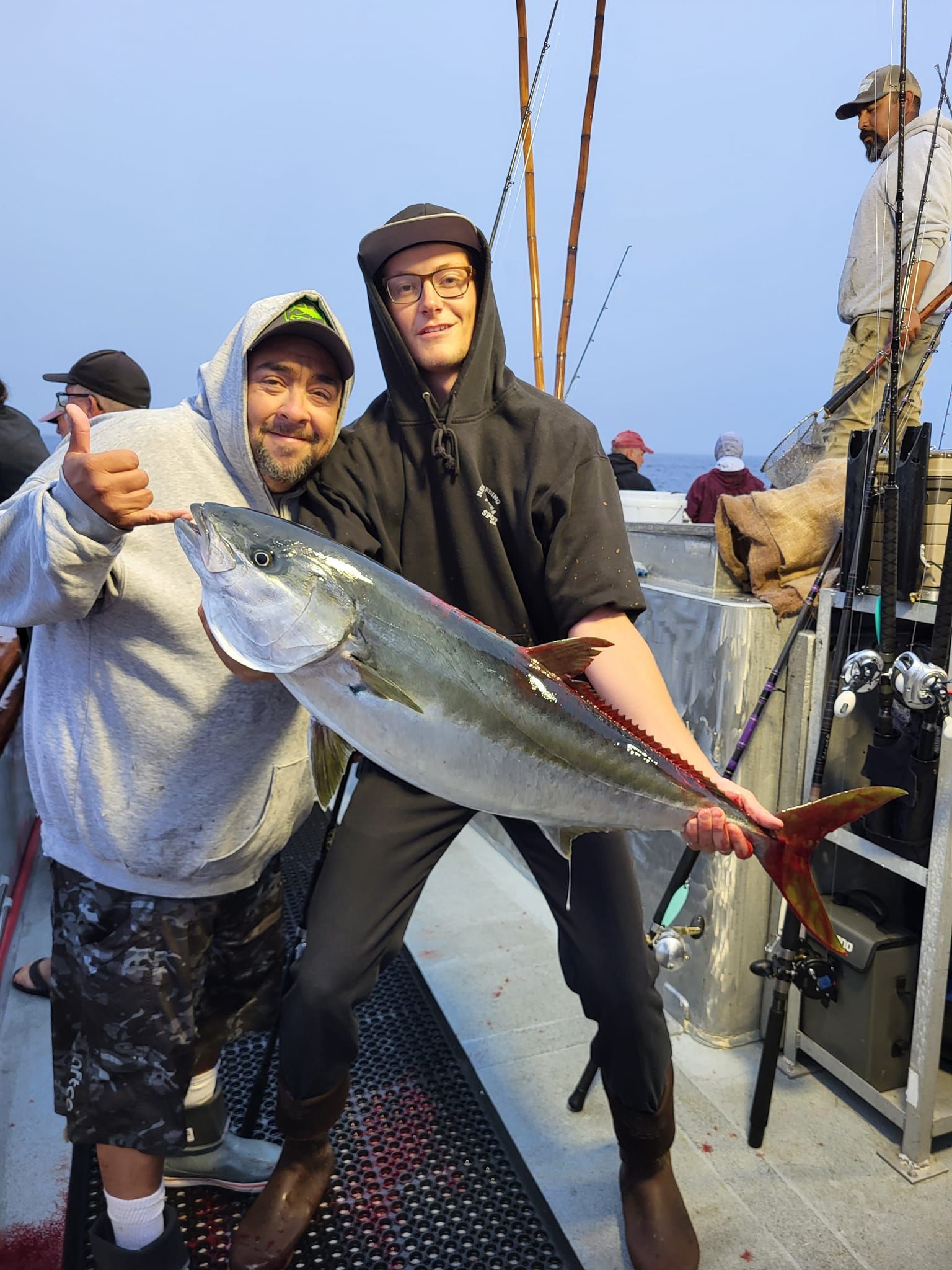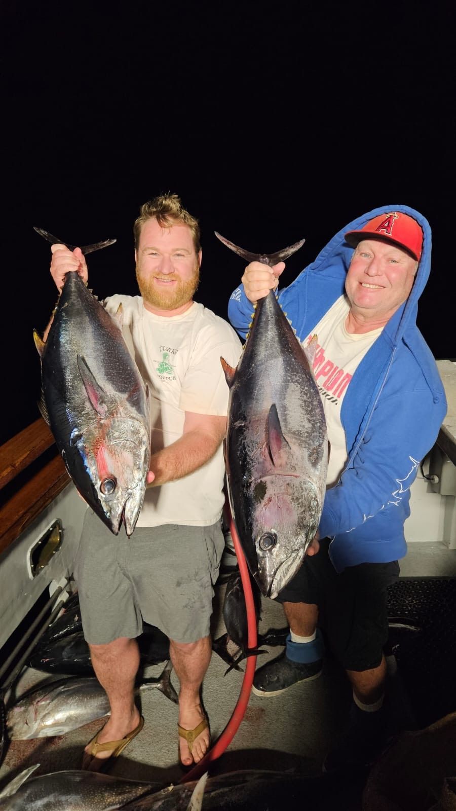 It was a smooth ride to the area north of SCI towards San Nicholas Island. It was not a secret where the fish were the day before. In the dark, it was easy to count over twenty boats. It seems we were a little late to the party, some boats that got them got them earlier in the night. We did get one small shot at fish in the dark landing a couple. They were school-size fish, they liked the “sinker bait rig” which was a sign of things to come.