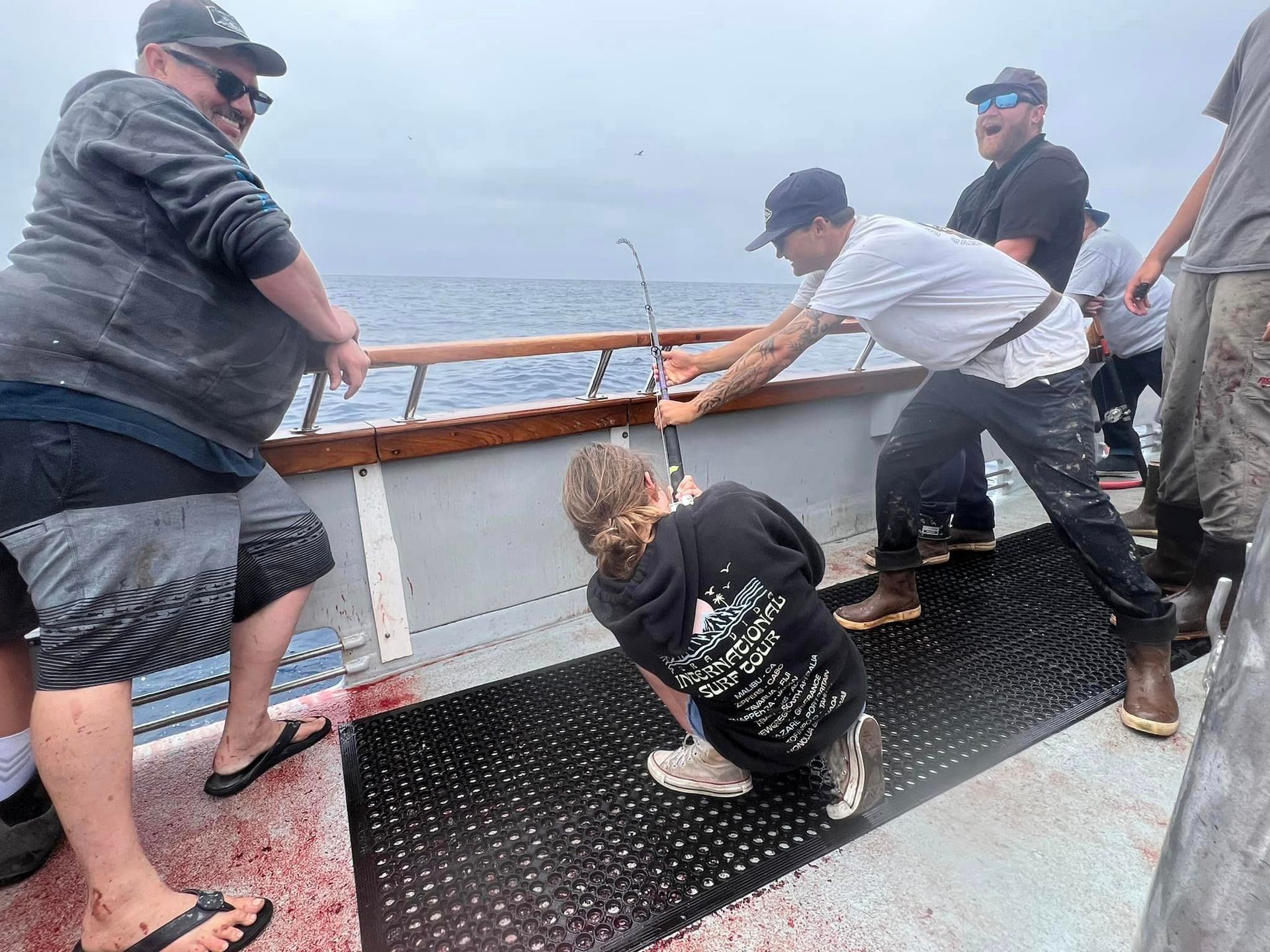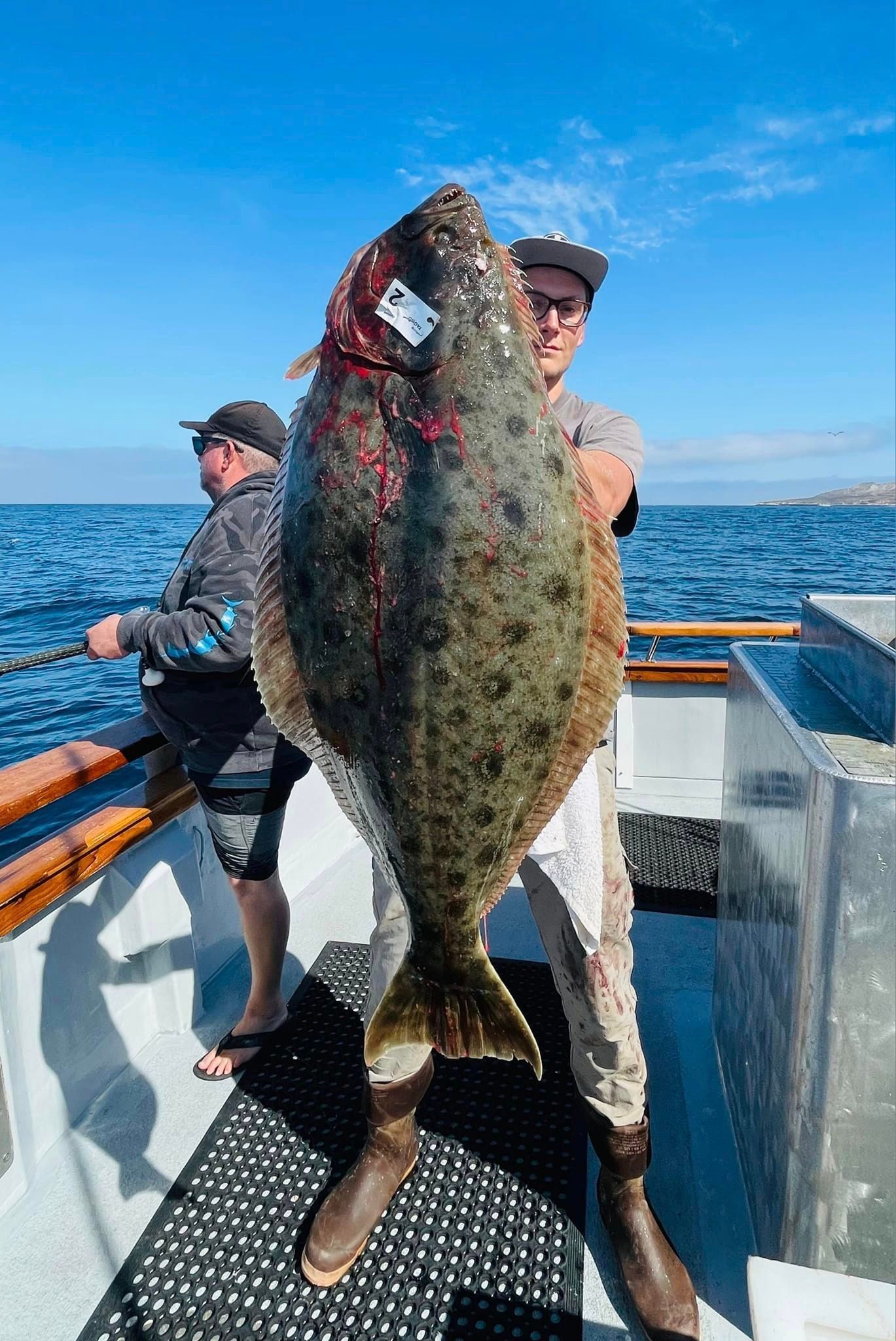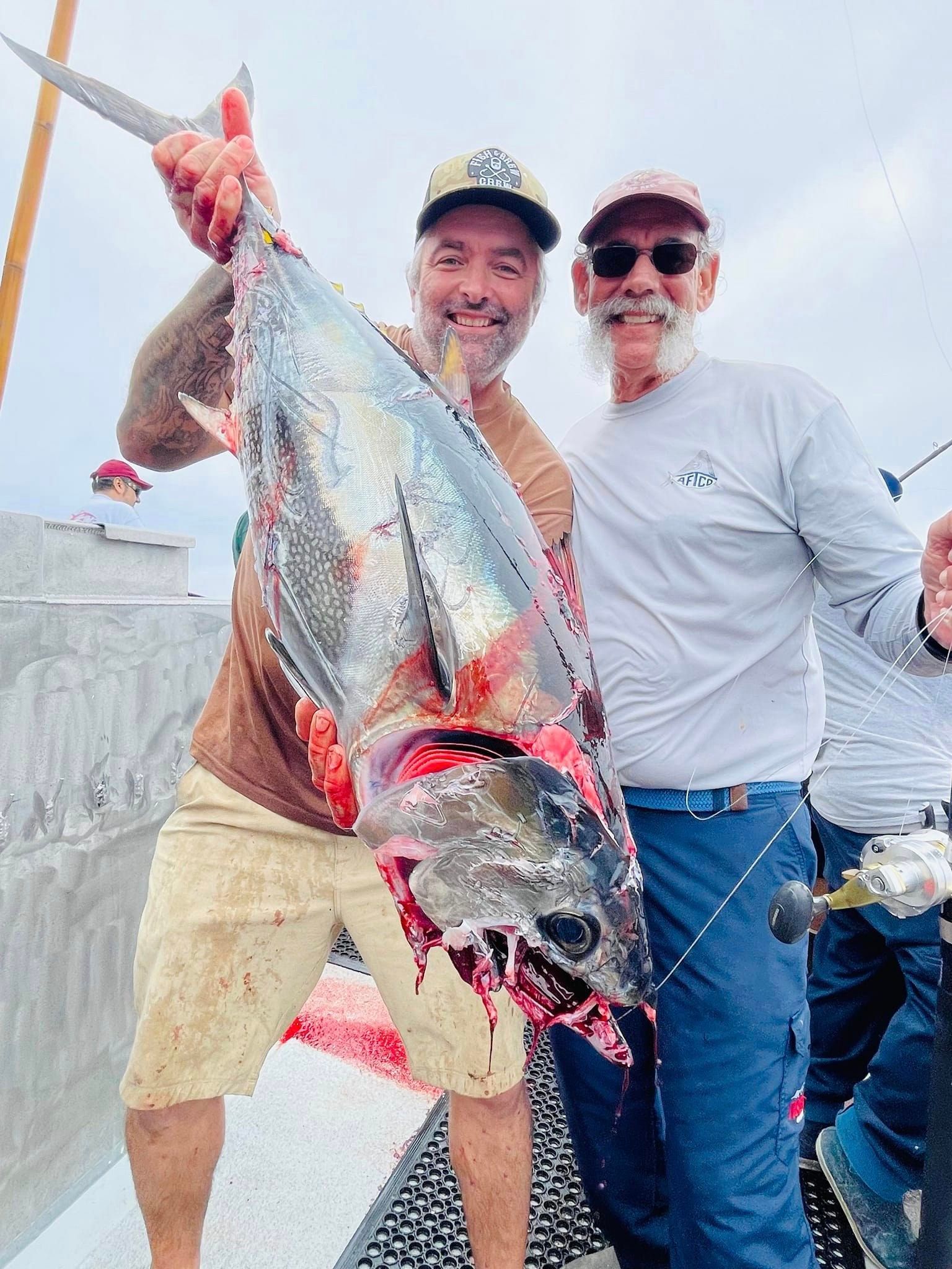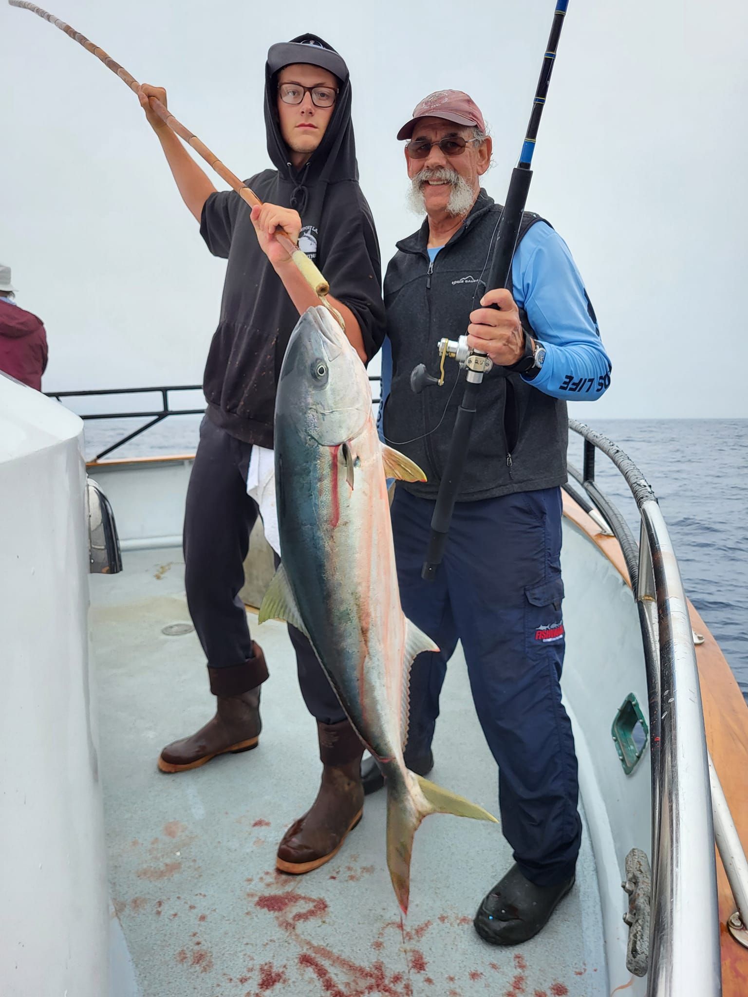 We did some severe damage on that school of fish, made a move and Jeff found another that played the same as the first. Jim continued to put on a clinic with his sinker rig. Some others tried it with success. After a few hours of catching ~100 BF all around 25#s, we had our 2-day limit. There was a stand-out 57# BF caught on that “Jim Bertella” special, congrats Jim. Bill had another standout he hooked on lighter line that took him around the boat many times and unfortunately, it picked up some loose flylined spectra that when trying to untangle things the wrong line got cut. Bill handled it like a pro but he was disappointed. We had our 2-day limits on the boat so we headed to San Nicholas Island to finish the day.