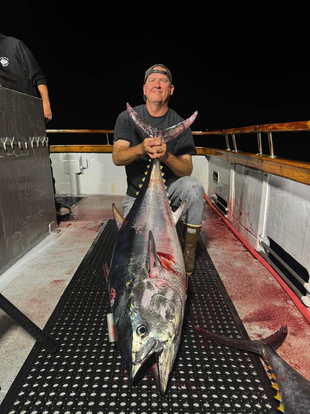 Anyway, the fish ranged from 35 to 135 pounds. There were 13 caught all total. Notables were Erich Kirsh getting his first bluefin, a 35 pounder, Brian Drazba and James Harris caught nearly identical 135 poundish bluefins. They were so close in size it would not be decided until the next day. Also putting bluefins on the boat that evening were Jeffy, Luke, Ron, Cory, Mike Bardon. The evening featured a tail- wrapped jack pot contending Bluefin, a gaff stealing Bluefin (gaff retrieved by deckhand Jose, fish retrieved by Ron) and a triple gaff miss by the crew, fish recovered the second time.