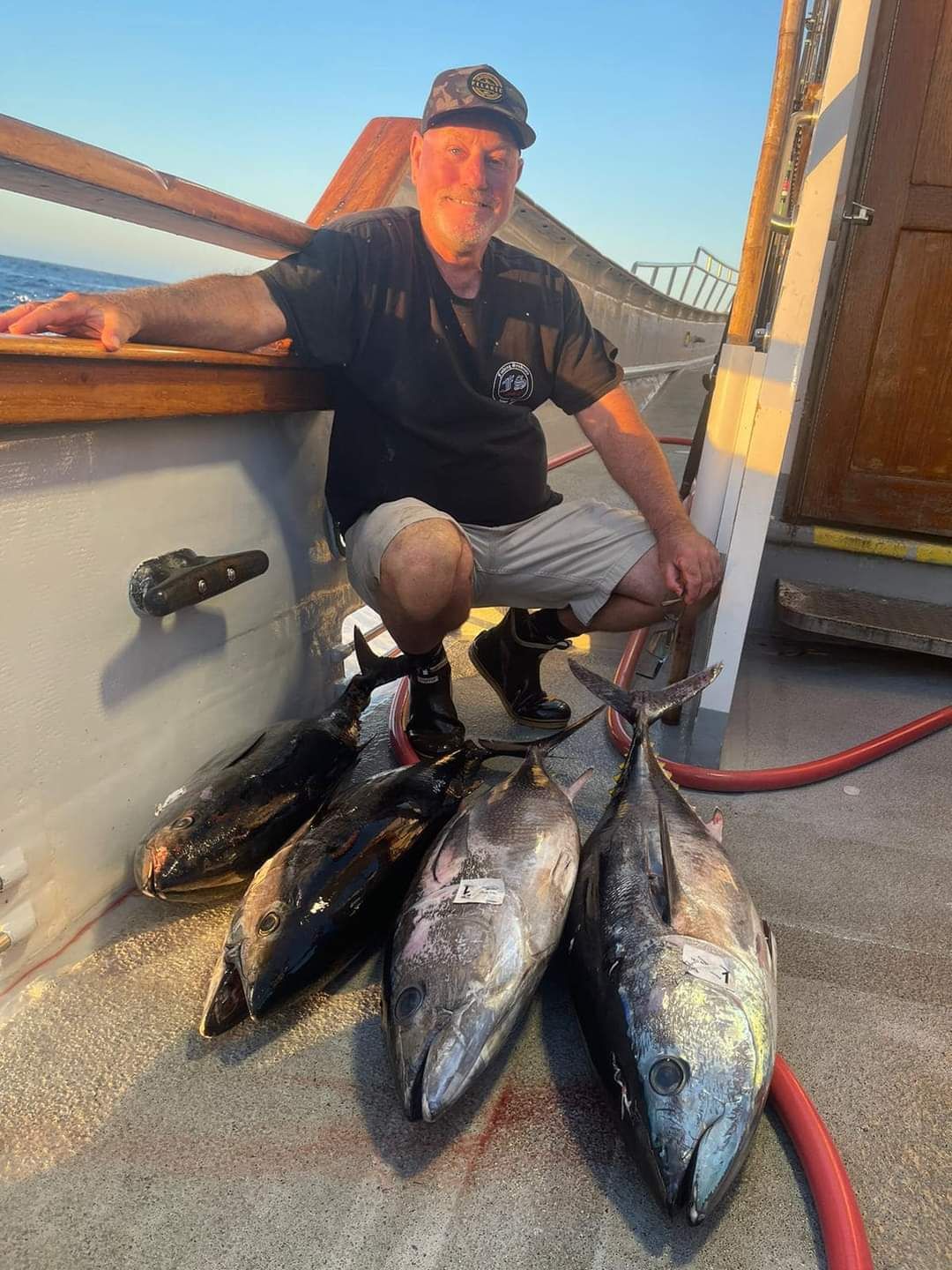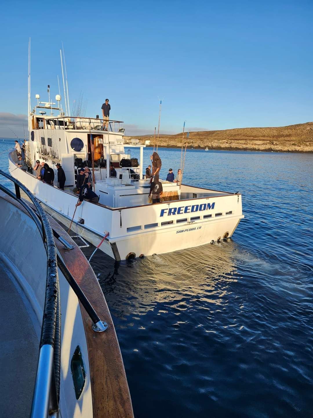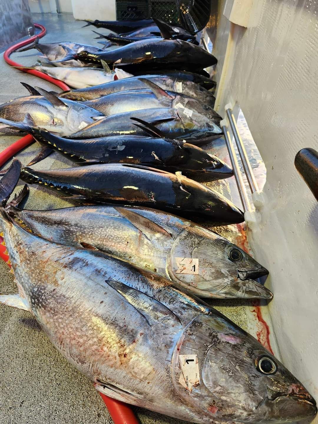 Trip #7: Boat: Thunderbird 2.5 day Departs: Tuesday, September 16th Fishing: September 17th, 18th Returns: September 19th am Thunderbird Crew: Jeff Markland- Captain Steve Raby- 2nd Captain Carmelo in the Galley Jose & Nate on deck The fishing schedule for 2025 has two 2 1/2 day trips and Trip #7 was the second one. Historically the 2 1/2 dayers fill quickly at the Annual Sign-Up Meeting. This was not the case this year as this trip only filled to about half during the Lottery and the rest of the spots were taken by guests. Here are the members who were on the trip: Gary Thompson, Steve Morgan, Mike Barton, Alex Mesko, Mike Higa, Bill Parks, John Lenker, Steve Lenker, Kyle Shimigawa, and Luke Burson (trip scribe). That is 10 members and the other 13 were all guests. The Club owns the following a big thank you for committing guests to this trip because without them this trip would have put a financial burden on the Club of $8,125. And the Club simply does not have those funds so the trip would have been cancelled. A special thank you to Mike Barton with 5 guests, Steve Lenker with 3, Mike Higa with 2, guests, Steve Morgan with 1 guest, Bryan Upcraft with 1 guest, and Luke Burson with 1 guest. And all the guests fit in perfectly and made it a good group to fish, sleep, and eat with for 2 1/2 days. As the trip approached Gary sent out information a week before with information about the trip. At that point the weather looked good and the fish counts were encouraging. As the trip got closer Gary sent out more information with the weather holding plus the Thunderbird getting limits on their weekend 2 1/2 dayer. All were feeling pretty optimistic about two things that had been missing on previous trips……nice weather and good fishing. On the day of departure, the usual members arrived early to ensure that they would board first to secure the tackle spots that are important to them, Others started to drift in throughout the afternoon. All were challenged with parking because of the local Wednesday street sweeping. Some were luckier than others but everyone found a parking spot. And then to our surprise the Thunderbird arrived close to 4 PM and it was obvious why…..very good fishing. To be specific they had back-to-back multi-day trips with limits of BF. And the buzz for all on the dock was pretty strong. They caught the fish at the Cortez, some at night near SCI but most during the day on bait. We asked about the bait and the group did not have good things to say. We quickly put two and two together that the fishing must be pretty good to do that well with poor bait. And another important item……NO STINKING FULL MOON! Jeff indicated we were headed back to Cortez and to save a little time we were going to take the direct course line around the east end of SCI. We’re expecting a flat smooth ride, we quickly learn that our course line had us in the rolley trough. It turned out to be anything but smooth. Our crew for the 2 1/2 trip was Jeff as our Captain, Steve as the 2nd Captain, Carmelo in the galley with Jose and Nat on deck. We have fished with them many times before so we knew we were in good hands for the 2 1/2 days. We stopped to load bait and to our surprise, that bait looked pretty good. The size could have been bigger as it was all medium to small-medium baits but it looked good. That even increased the anticipation of what was to come. As it turned out about 60% turned red while the rest was good bait. For the next two days, you really had to pick through what was in the hand wells to find the good ones. As we rolled into the “Bank” there was a pretty good electrical show to the west from about 3 AM to 5 AM plus some slight rain. And we could see some boats in the distance. We would learn that we would not be alone at Cortez Bank but because of the way the fish were spread out it would not make a difference. Jeff got the anchor down close to the position that they had success on the last trip and it took a little time for the fish to find us……and they did. It was a slow pick for the next 4 or 5 hours. Occasionally we would have 2 for 3 going but most of the time it was one at a time. The conditions were perfect, a strong current in the right direction and some breeze to keep the boat a little crossways to the current. Jeff said the conditions were perfect. As the morning continued there were two ways to get a bite: 1) hot bait close to the boat, or 2) long soak behind the boat. Although detailed records were not kept it seems that the hot baits close to the boat got 4 to 5 times the bites compared to the long soak. This getting bit close to the boat with hot baits was shared with all as it was working great for a few: light line (20#), small hooks (#6 or #8), the best bait in the well, and then give that bait 30 seconds, and if no bite wind in and do it again. And if the bait did not “swim” then cut your losses and wind in to do it again. Some fished that way and were rewarded, others continue to soak their baits. It was a little frustrating that so many were locked into soaking baits when the other method was working so well. It just must be too much work to change baits every 30 seconds and it is easier to soak them behind the boat. The few anglers who changed baits quickly did pretty very well while others did not……that’s fishing. The fish seem to leave us around 2 PM so Jeff decided to go looking in the direction of SCI. By heading back toward SCI we would have a shot at bigger fish at night. We ran all the way back to within 5 miles of SCI and never saw anything on the electronics. When it got dark the effort changed to working the area where the BF had been at night but after about 5 hours of looking without a single mark on the electronics Jeff decided to head back to Cortez to fish the same location we were in that morning. Carmelo prepared an excellent dinner of marinated chicken, basmati rice, and a Greek-style salad. And of course, it was finished 