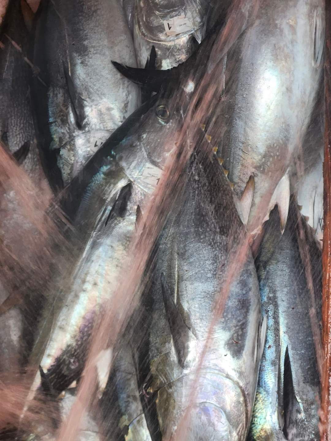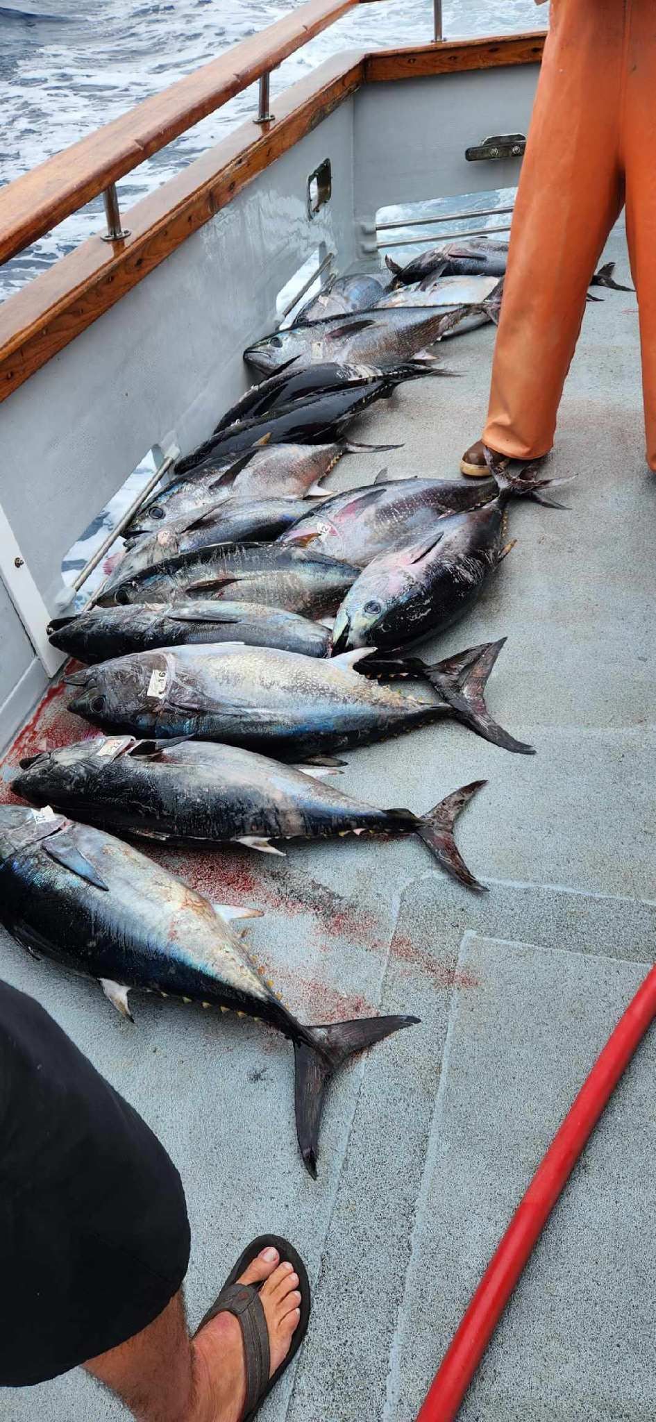A boat deck with a large haul of various fish, including tuna, after a fishing trip.