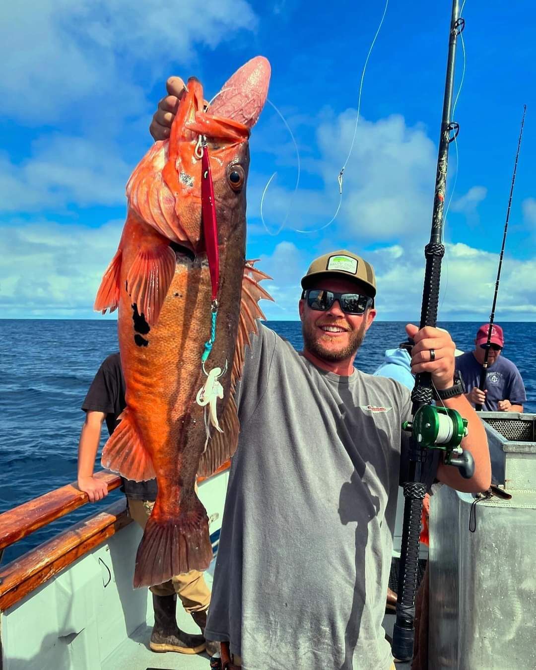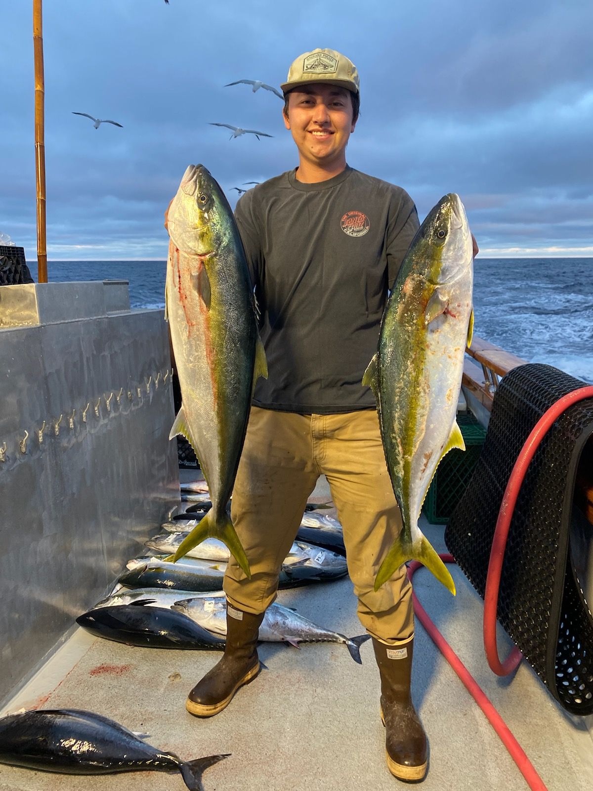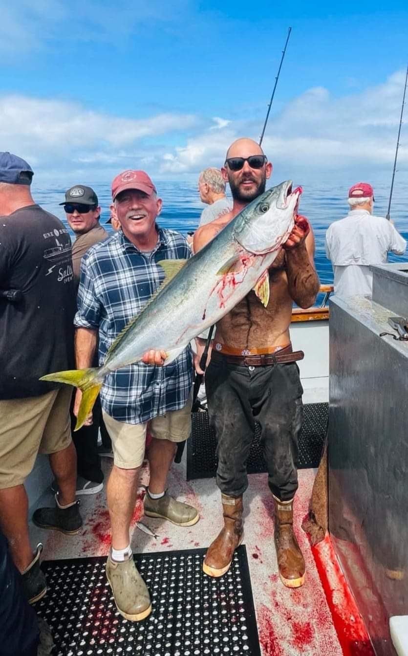 Day 1 we arrived at Cortez bank around 5:30 am. After a night of getting rocked by large swells we awoke to a sea that was not all that happy to have us and not very willing to give up the fish. It was on the tougher side of things, but we still managed to scrape out a pretty good haul of fish. With a tally of 47 fish caught from good sized yellow tail to smaller blue fin from 20 lbs to the largest being 55 lbs caught by our Junior Angler Lucas Harris. Now, I believe, young Lucas learned a valuable life lesson on this trip, if you don’t gamble you can’t win. The next biggest fish, patch recipient, and pot was caught by Steve Sturm! Day 1 ended with a trip back to the bait barge because the bait was not great.