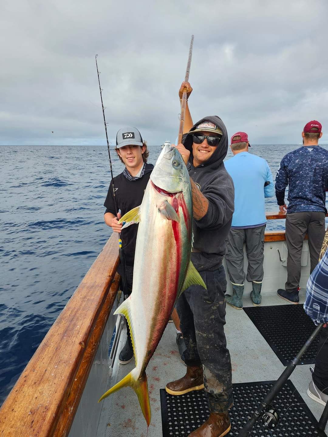 Two men on a boat hold up a large yellowtail fish with a mountainous background.