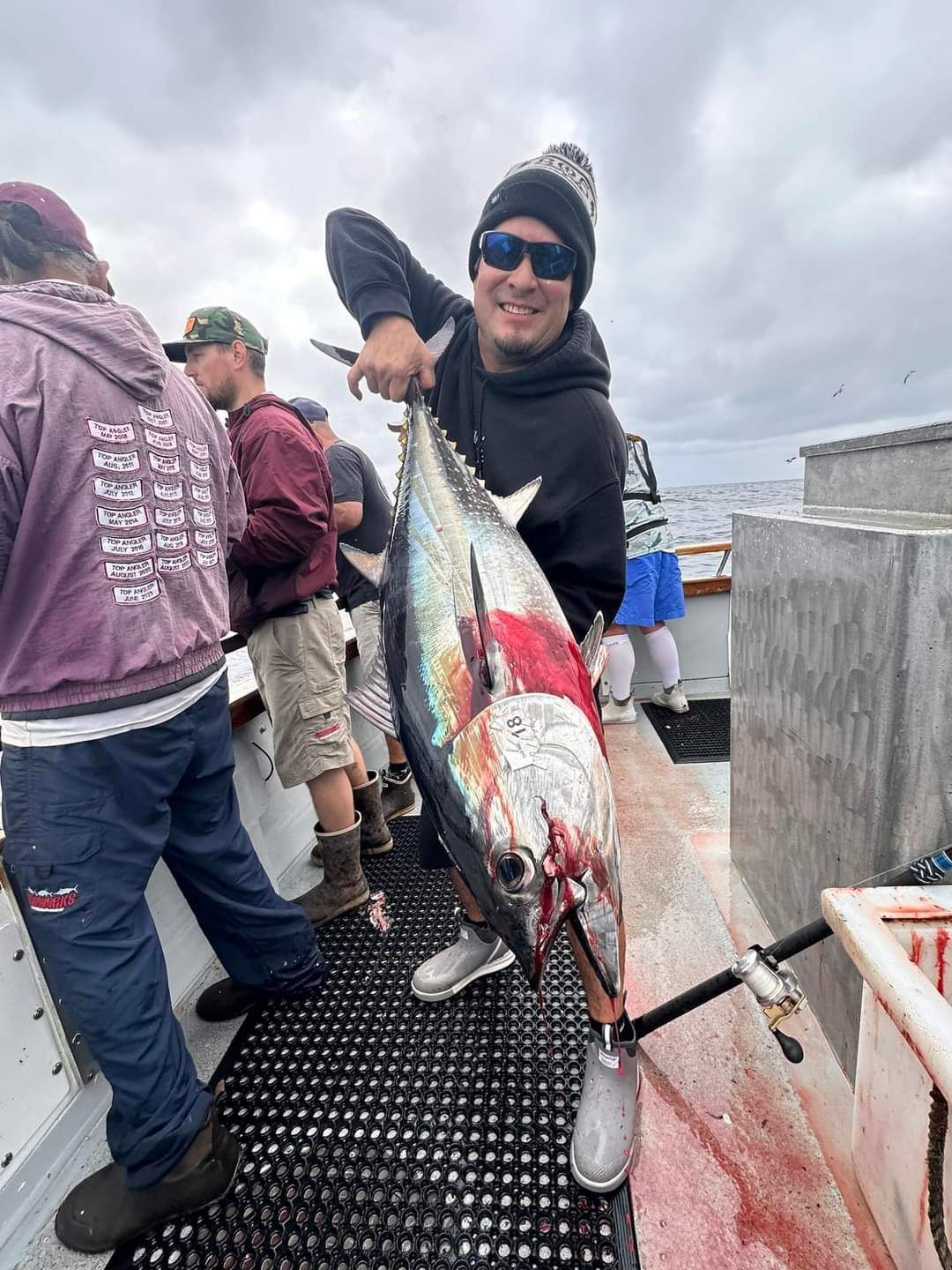 Trip #5: Boat: Thunderbird 2.5 day Departs: Tuesday August 19th Fishing: August 20th, 21th Returns: August 22th am Thunderbird Crew: Jeff Markland- Captain Steve Raby- 2nd Captain Jose, Jared & Nate on deck Goofy in his usual form in the Galley The usual suspects, newer club members and a slew of guests began gathering for the upcoming 2.5-day venture on board the Thunderbird on Tuesday afternoon/evening, a lot of discussion occurred around where will we fish, what is our bait, are we going to fish for tuna, and more importantly, the weather. Forecast was for pretty breezy on the outer banks and tuna grounds with somewhat better at the island. Thursday weather looked much improved everywhere. As it turned out, the weather turned out nice the first day, and even nicer the second day. Also the good news was we would have sardines for bait. When the boat returned from the fuel dock around 7:30, I wandered down to the boat and sat with Jeff and discussed our “options”. There was about 2 scoops of live squid on the boat and the squid at San Clemente Island was available but by jigging. Also, the yellowtail fishing was hit or miss at best early in the cove, and then really nothing to catch the rest of the day unless the bass decided to bite. The tuna grounds were in range to do some night fishing between the days, and daytime fishing was producing smaller fish. The Tanner Bank had the 10-15 lb variety which was spotty, and inside toward SCI were bigger 30-35lb variety with some larger mixed in. Getting bites though would be hard. The Cortez Bank coughed up 100 yellowtail for Jeff a few days before. There was also some white sea bass caught at San Nicholas Island so that was an option. Soooo, one more time, what to do. Jeff decided he will decide when we leave the bait receiver as I said give it your best shot. The final decision, with the weather forecast improving, we would head to the Cortez Bank since there had been some yellowtail there a few days before. And off we went. Travel out was not too bad. Day 1- Arrived at the Cortez Bank around 7:45 am, fished a couple areas for nothing except some of the jumbo bonito, large mackerel and a few bottom dwellers. There was no sign of yellowtail. Where the F**k did they go? Around 10:00am, Jeff pulled the plug and we headed back inside to the tuna grounds, about 30 miles away. Weather was getting much nicer, We ended up picking at the BFT not long after we arrived in the area around 2:00pm and joined “the fleet”. We had one decent plunker drift for 16 BFT, and scratched up 9 more at sundown. As dark fell, we headed into the island to try for the early morning yellowtail fishing at the Lost Point area. Day 1 fish count- 25 BFT, 4 Bonito kept, a few misc bottom dwellers kept JP winner- Bronson Noggle (Cory Steinwand Guest)- 30 plus lb BFT, Patch winner Cory Steinwand- 30 plus lb BFT (it was very close) Day 2- had a few yellowtail bites in the dark and grey light at Lost Point, all nice fish. Headed out after grey light for yesterday’s tuna grounds. Flat calm weather. Worked the area with “the fleet” for a couple of hours and covering a lot of water. Jeff finally pulled the plug and decided to take a gamble and head to the Tanner Bank since there were tuna there a few days before. And the gamble certainly paid off. We were greeted with boiling fish in the chum circle when we arrived, boiling fish on the anchor and steady fishing on the 10-15 lb BFT the rest of the afternoon. We fished a couple deep spots for decent reds and other stuff, one nice ling cod and headed back to the area west of SCI toward San Nicholas Island for some night fishing. We had several stops on spots of fish, and got a few anywhere from 30 plus lbs up to 100lbs. Around midnight, we headed home. We were able to fish that long because by chance, the boat was not scheduled to run a ¾ day trip when we got in, so we got to fish longer. Arrived at the dock around 7:20am, unloaded and that was it. Day 2 fish count- 6 Yellowtail, 40 BFT, 1 Halibut, 2 Barracuda, 100 plus mixed Reds and Rockfish, 1 Ling Cod JP & Patch winner- Cory Steinwand- 102 lb BFT Trip total- 65 BFT, 6 Yellowtail, 1 Halibut, 4 Bonito, 100 plus mixed Reds/Rockfish, 1 Ling Cod The weather for the entire trip was good. Temperature cool both days but very nice. Very little wind to flat calm the entire 2 days. One thing that was troubling was the amount of casualties on these smaller tuna. Seems like most everyone liberated one or two, or more. (We won’t mention my luck!). Small hooks and light line with too much pressure and these little guys were hot! All in all a good time had by all and a very good group of guests on this trip as well. That’s it! Your Scribe- Gary Thompson