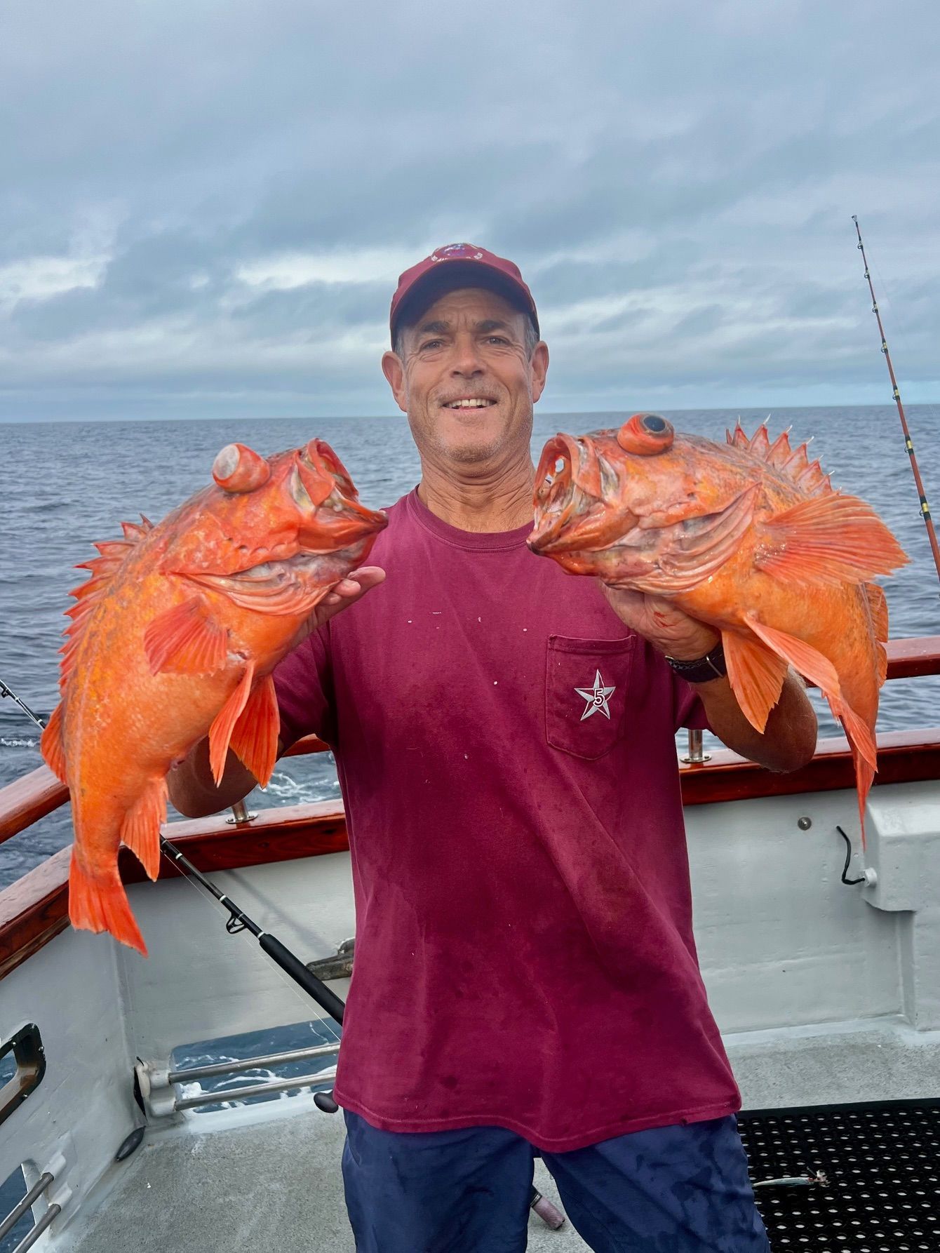 The morning of day two started similarly to day one. The short soak with a hot baits was again working but so was the longer soak. The fish catching was spread out among all fishing. And there were some consistent bigger models in the mix, still the 12-15 pounders but more of the 20 pounders and 30 pounders. Jeff moved the boat a few times, we drifted some, and also anchored in deeper water. While drifting and in the deeper anchored spots a few fish were caught on the “drop shot rig” but most were caught flylining. At times time guys fishing 25# and 30# got bit as well as the 20#. We worked this well into the afternoon when it was ROCK CODDING time. And we did not have to travel but a few miles.
