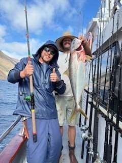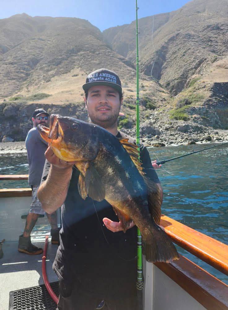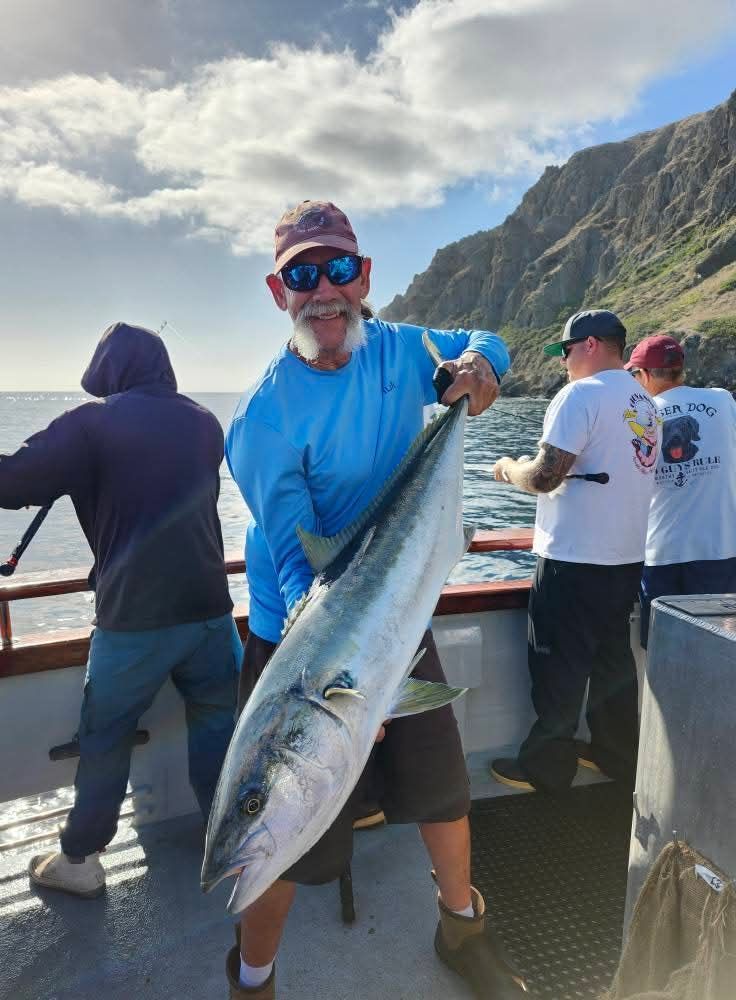 Day 2, Stop #3: We made another move away from the Cove and around to the frontside and shortly after getting the boat all settled on the hook, Luke hooked into a nice drag puller on a fly lined Sardine that elected to run straight down. We were in pretty tight to a reef and the fish on the other end of Luke’s line seemed legit as he moved throughout the boat and caught a bunch of line and tangles as he maneuvered his way to the stern. It was a bit of a cluster, but the crew did a great job of keeping Luke in contact with his fish which later came to gaff as a thin YT probably in the mid 20s. The Calicos were really starting to go when the Navy came running towards us and ultimately booted us off the spot…