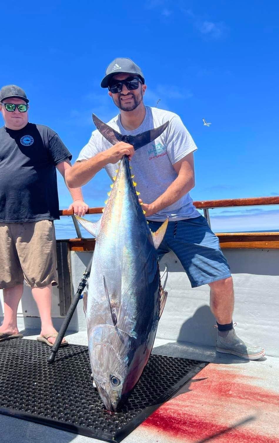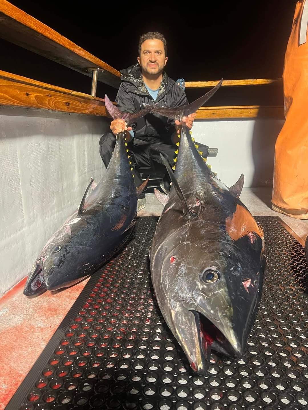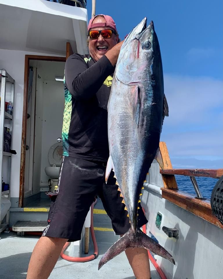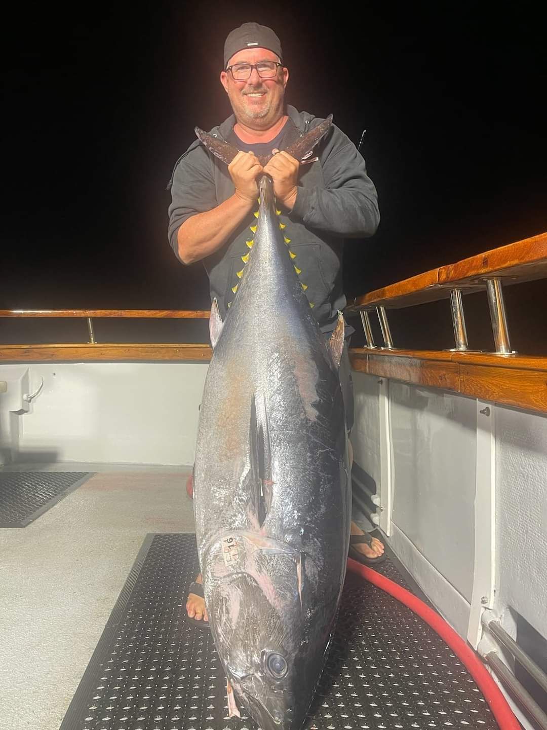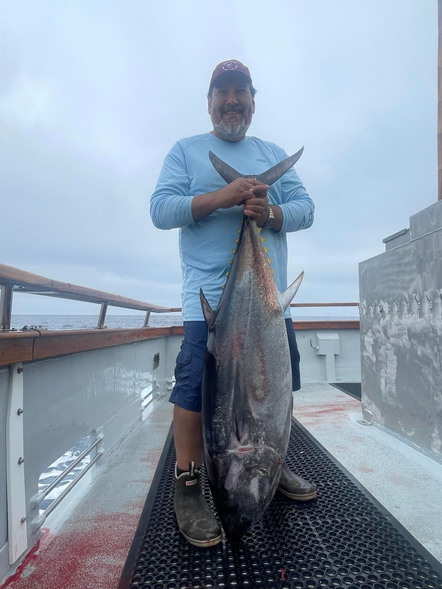 Just past midnight, Capt. Chris decided to make a big move and run towards San Nicolas Island. This area had been productive on Trip 4 and it was worth a shot. We pushed within 18 miles of the island and could not find what we wanted. Chris made the U-turn and pointed towards the zone we had previously fished for most of the trip. Around 2am, we found the right school. Those who paid their dues at the rail scored. Most of the fish were caught between 150ft-360ft. Heavy knife jigs were the ticket. Several standout fish were picked in this stop with guest angler Saif Liswi pulling out a 142 pounder and this was the jackpot fish for the day.  Yours truly also got on the action with two fish. This bite continued into the early morning. This would be the last bluefin bite of the day. We ended with 13 bluefin. Paul Casillas obtained a patch for his 74lb fish. Well done, Paul!