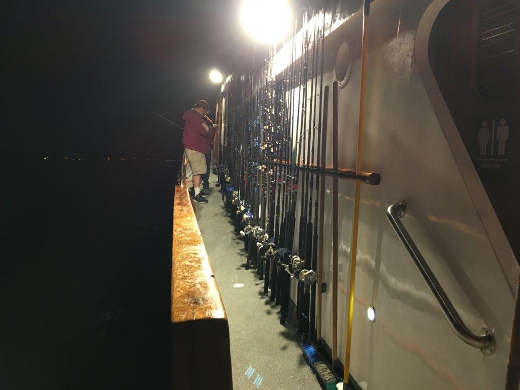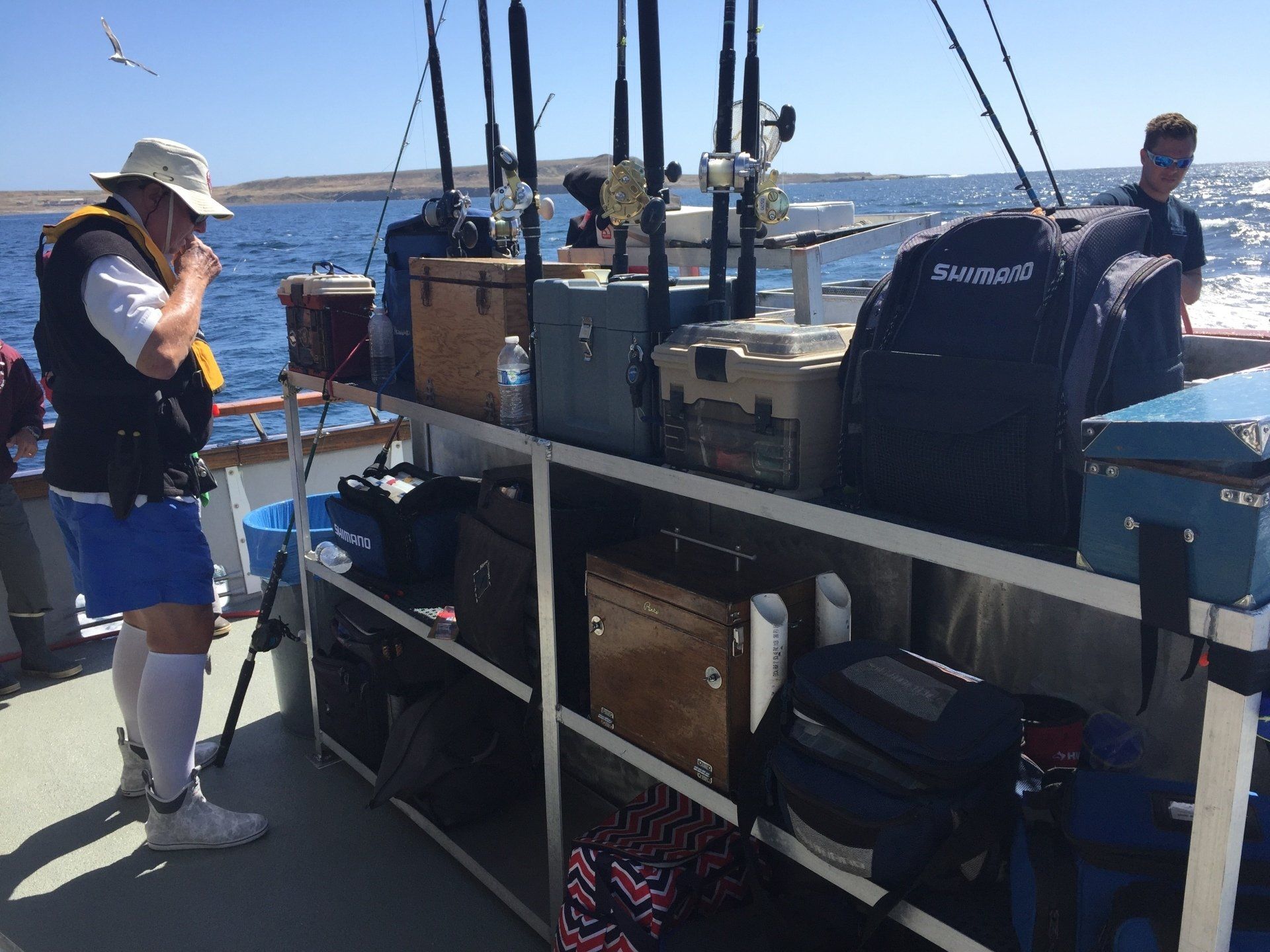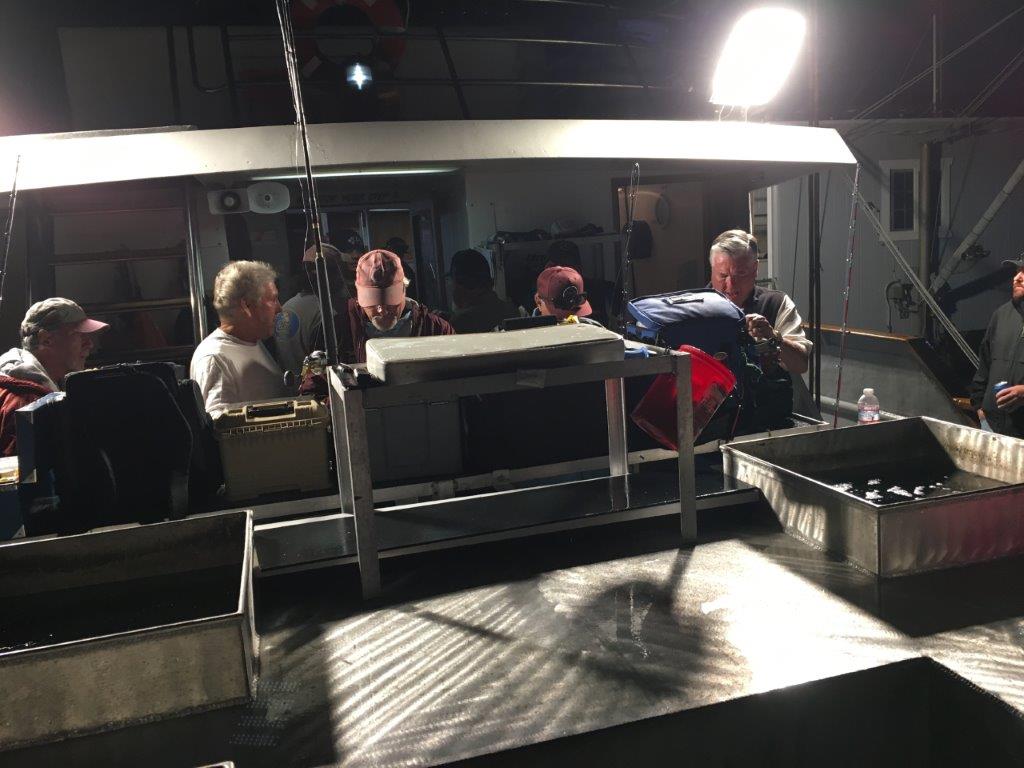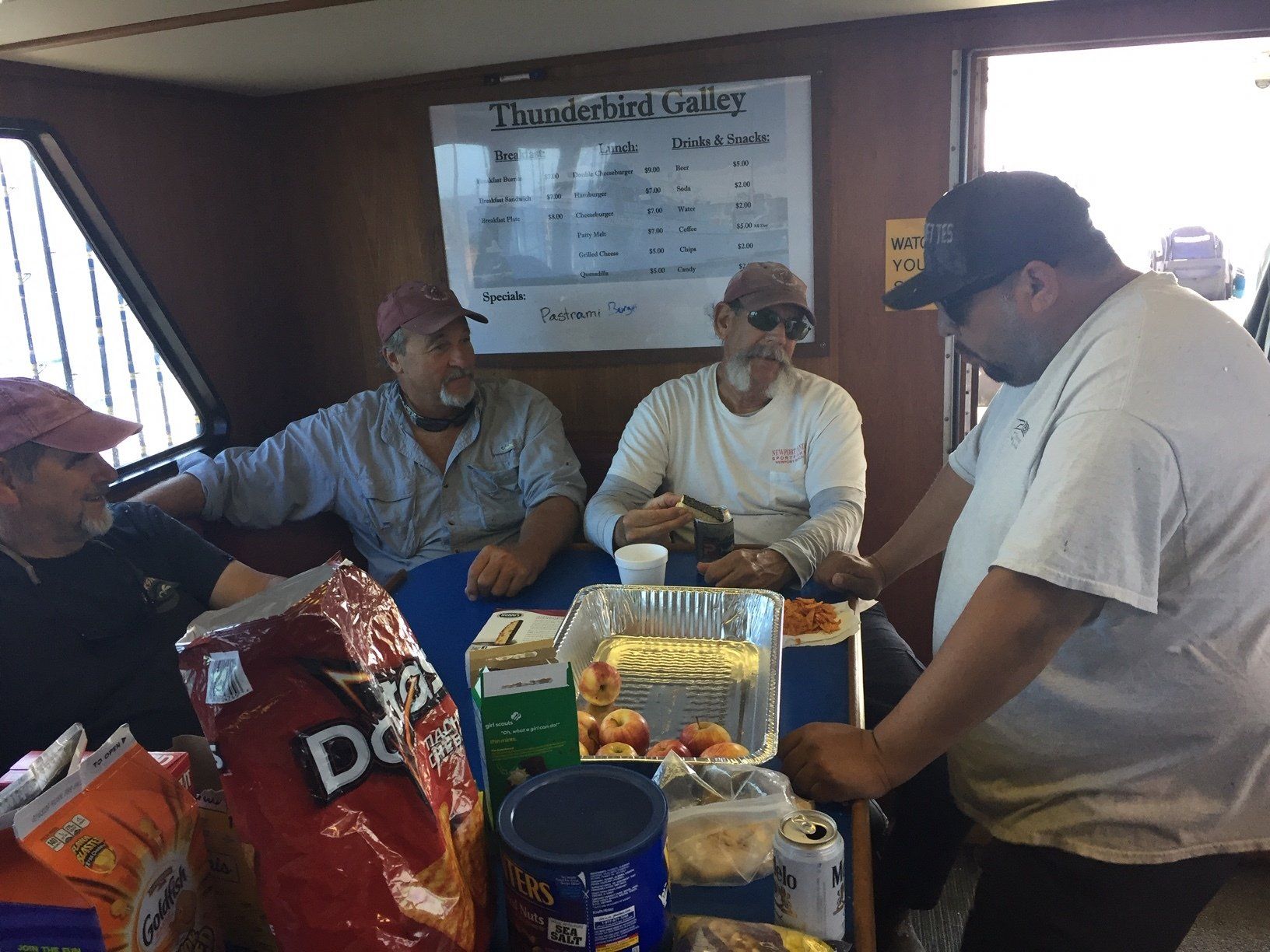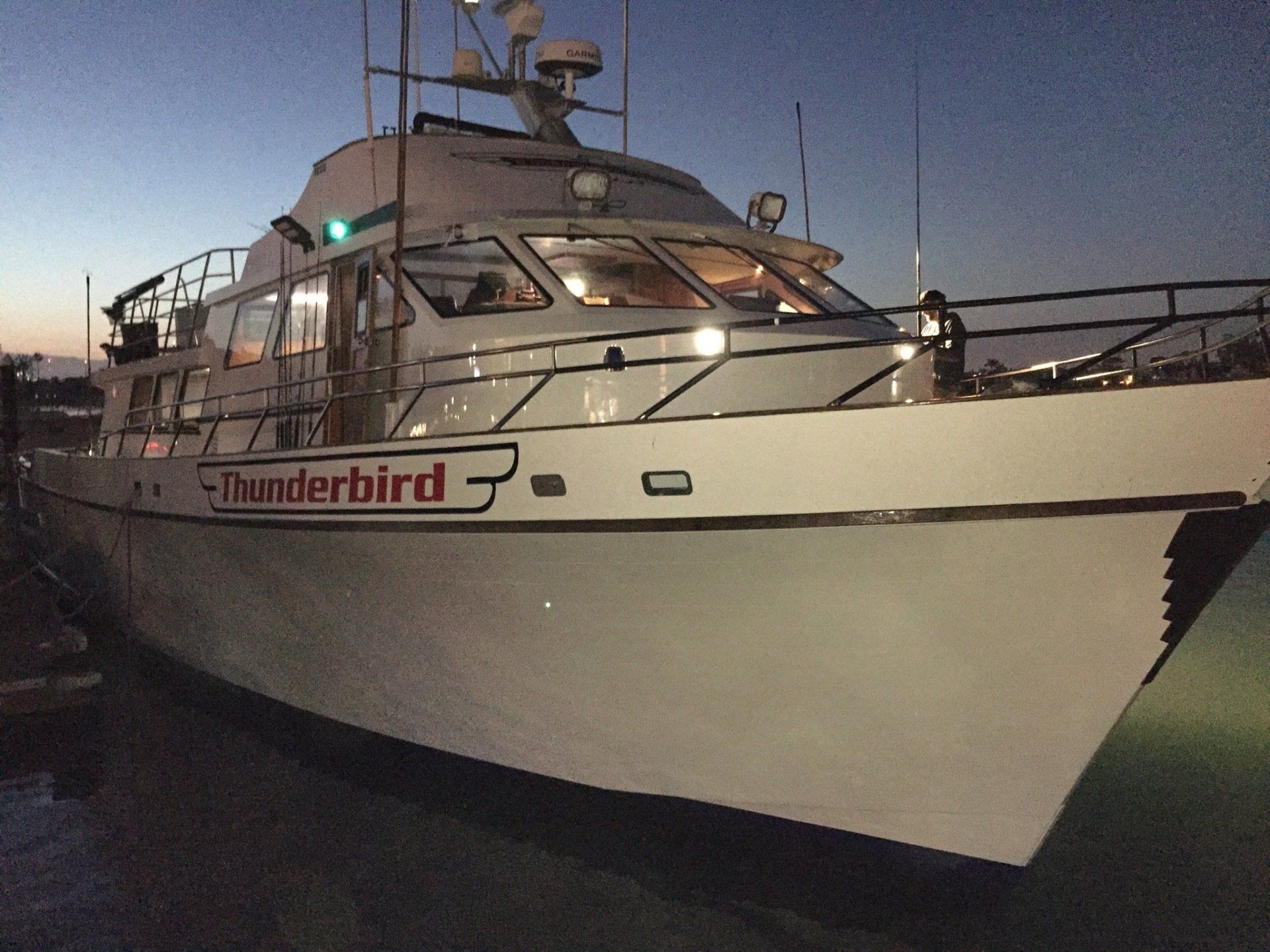 Trip #8: Boat: Thunderbird 1.5 day Departs: Thursday, October 2th Fishing: October 3th, 4th Returns: October 4th pm Thunderbird Crew: Capt. Jeff Capt. Chris Jose Nate Goofy Cast of Characters: Bill Parks Steve Morgan Riley Dyer Jim Bertella Justin Becker Jacob Richards Luke Burson Paul Morgan Mike Allen (Scribe) Patrick Thunyakij Bruce Granse Kevon Kong Michael Harris Ryan Burson Oscar Ochoa Ed Chutney Jeff Allen Andrew Ron Shrout Murphy Parks Romeo Ochoa James Harris Ozzie Baktiari Arriving for a trip in the month of October at Newport Landing is a far easier experience then one would have in the summer months of June – September. The dread of driving through the neighborhood in hopes of an empty space large enough to accommodate the larger trucks that many of the club members own seems to dissipate as the offerings are far more plentiful. While the welcomed views of summer also tend to be less abundant, the ensemble of club members arrived with plenty of time to catch-up on some conversations and enjoy a beverage or two.