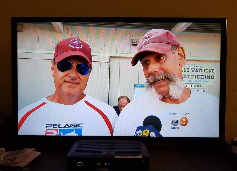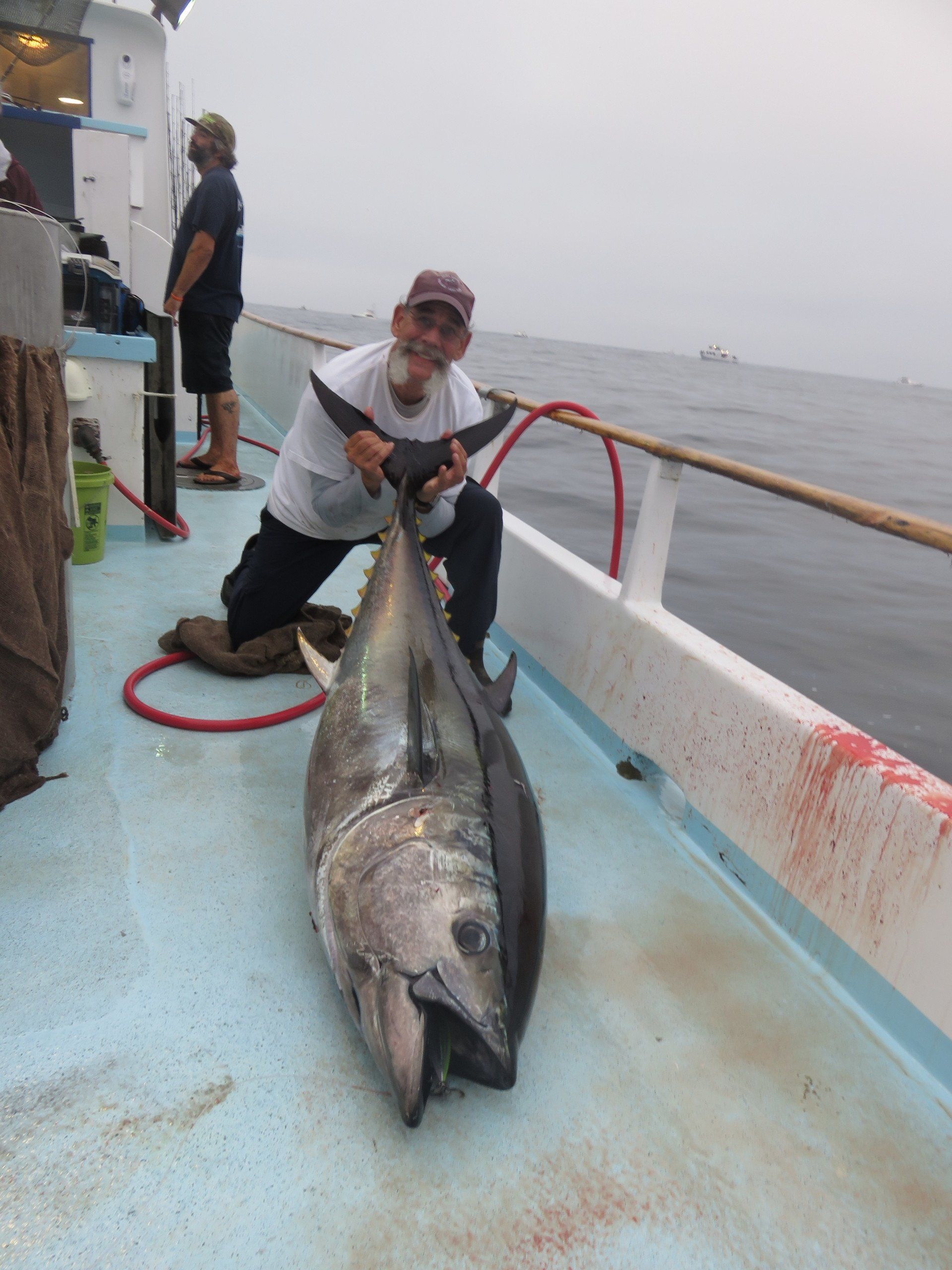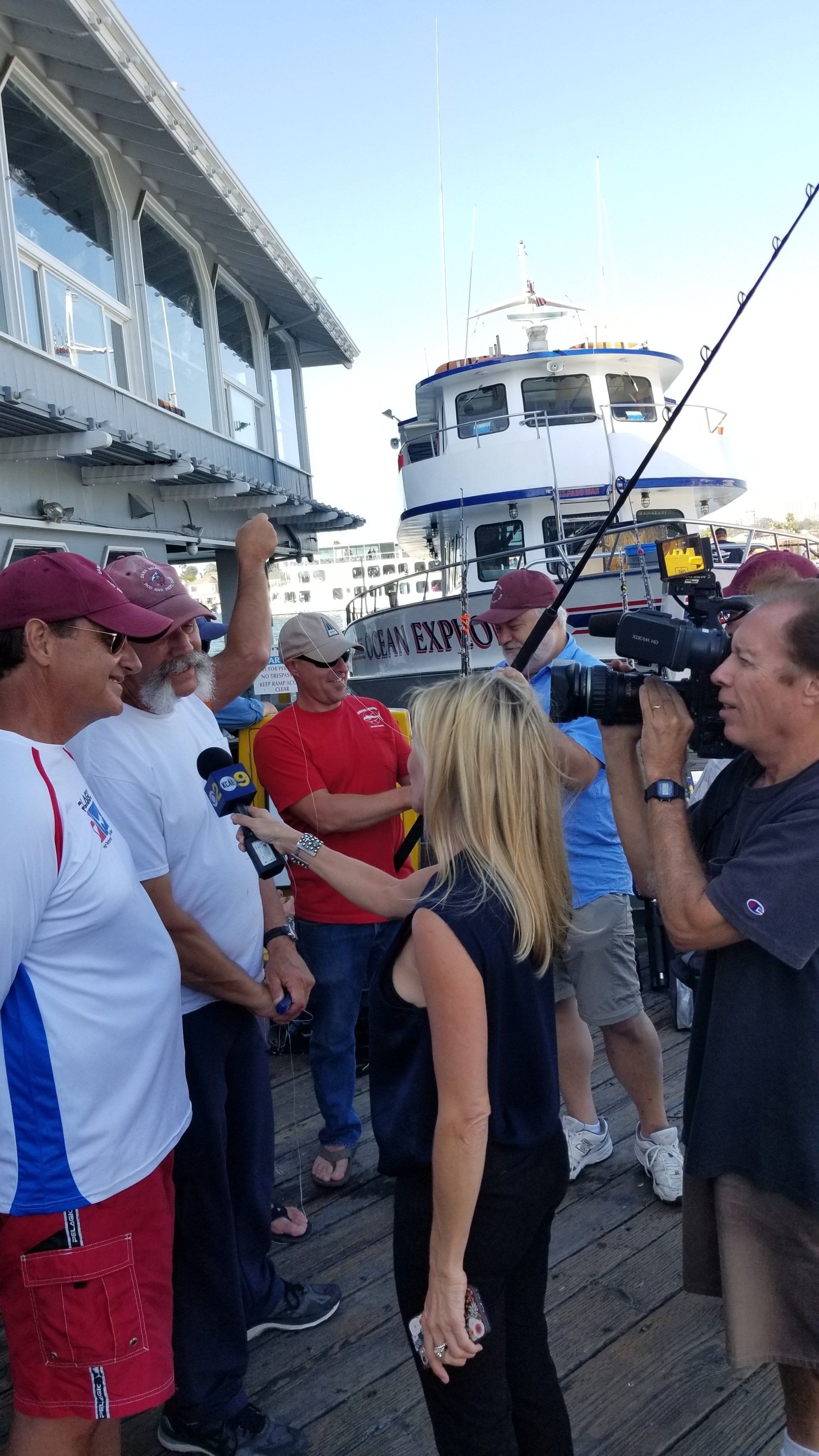If you haven't heard, we had a special guest who wanted to find out more about the recent cow sized bluefin. Stacey Butler from KCAL 9 news interviewed a few of the guys and loved them so much she was waiting for us back at the landing Saturday evening...with her bodyguard and a cooler for the promised fish. This all went down before your scribe was at the docks so be sure to ask about this at the Picnic if you weren't there… And now for the trip!