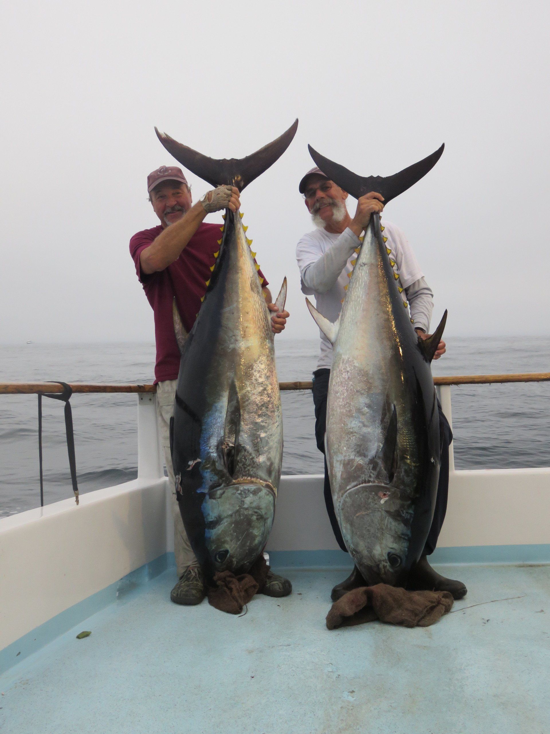 Trip #5: Boat: Thunderbird 2.5 day Departs: Tuesday August 19th Fishing: August 20th, 21th Returns: August 22th am Thunderbird Crew: Jeff Markland- Captain Steve Raby- 2nd Captain Jose, Jared & Nate on deck Goofy in his usual form in the Galley The usual suspects, newer club members and a slew of guests began gathering for the upcoming 2.5-day venture on board the Thunderbird on Tuesday afternoon/evening, a lot of discussion occurred around where will we fish, what is our bait, are we going to fish for tuna, and more importantly, the weather. Forecast was for pretty breezy on the outer banks and tuna grounds with somewhat better at the island. Thursday weather looked much improved everywhere. As it turned out, the weather turned out nice the first day, and even nicer the second day. Also the good news was we would have sardines for bait. When the boat returned from the fuel dock around 7:30, I wandered down to the boat and sat with Jeff and discussed our “options”. There was about 2 scoops of live squid on the boat and the squid at San Clemente Island was available but by jigging. Also, the yellowtail fishing was hit or miss at best early in the cove, and then really nothing to catch the rest of the day unless the bass decided to bite. The tuna grounds were in range to do some night fishing between the days, and daytime fishing was producing smaller fish. The Tanner Bank had the 10-15 lb variety which was spotty, and inside toward SCI were bigger 30-35lb variety with some larger mixed in. Getting bites though would be hard. The Cortez Bank coughed up 100 yellowtail for Jeff a few days before. There was also some white sea bass caught at San Nicholas Island so that was an option. Soooo, one more time, what to do. Jeff decided he will decide when we leave the bait receiver as I said give it your best shot. The final decision, with the weather forecast improving, we would head to the Cortez Bank since there had been some yellowtail there a few days before. And off we went. Travel out was not too bad. Day 1- Arrived at the Cortez Bank around 7:45 am, fished a couple areas for nothing except some of the jumbo bonito, large mackerel and a few bottom dwellers. There was no sign of yellowtail. Where the F**k did they go? Around 10:00am, Jeff pulled the plug and we headed back inside to the tuna grounds, about 30 miles away. Weather was getting much nicer, We ended up picking at the BFT not long after we arrived in the area around 2:00pm and joined “the fleet”. We had one decent plunker drift for 16 BFT, and scratched up 9 more at sundown. As dark fell, we headed into the island to try for the early morning yellowtail fishing at the Lost Point area. Day 1 fish count- 25 BFT, 4 Bonito kept, a few misc bottom dwellers kept JP winner- Bronson Noggle (Cory Steinwand Guest)- 30 plus lb BFT, Patch winner Cory Steinwand- 30 plus lb BFT (it was very close) Day 2- had a few yellowtail bites in the dark and grey light at Lost Point, all nice fish. Headed out after grey light for yesterday’s tuna grounds. Flat calm weather. Worked the area with “the fleet” for a couple of hours and covering a lot of water. Jeff finally pulled the plug and decided to take a gamble and head to the Tanner Bank since there were tuna there a few days before. And the gamble certainly paid off. We were greeted with boiling fish in the chum circle when we arrived, boiling fish on the anchor and steady fishing on the 10-15 lb BFT the rest of the afternoon. We fished a couple deep spots for decent reds and other stuff, one nice ling cod and headed back to the area west of SCI toward San Nicholas Island for some night fishing. We had several stops on spots of fish, and got a few anywhere from 30 plus lbs up to 100lbs. Around midnight, we headed home. We were able to fish that long because by chance, the boat was not scheduled to run a ¾ day trip when we got in, so we got to fish longer. Arrived at the dock around 7:20am, unloaded and that was it. Day 2 fish count- 6 Yellowtail, 40 BFT, 1 Halibut, 2 Barracuda, 100 plus mixed Reds and Rockfish, 1 Ling Cod JP & Patch winner- Cory Steinwand- 102 lb BFT Trip total- 65 BFT, 6 Yellowtail, 1 Halibut, 4 Bonito, 100 plus mixed Reds/Rockfish, 1 Ling Cod The weather for the entire trip was good. Temperature cool both days but very nice. Very little wind to flat calm the entire 2 days. One thing that was troubling was the amount of casualties on these smaller tuna. Seems like most everyone liberated one or two, or more. (We won’t mention my luck!). Small hooks and light line with too much pressure and these little guys were hot! All in all a good time had by all and a very good group of guests on this trip as well. That’s it! Your Scribe- Gary Thompson